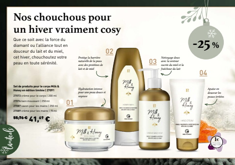 limiteds01020304-25 %55,76 %u20ac 41,69 %u20ac1%u20ac27073 cr%u00e8me pour le corps |%u00a0200 ml27074 bain moussant | 250ml27087 savon pour les mains | 250%u00a0ml27089 cr%u00e8me pour les mains |%u00a075mlSet de produits pour le corps Milk & Honey en %u00e9dition limit%u00e9e | 27091Que ce soit avec la force du diamant ou l%u2019alliance tout en douceur du lait et du miel, cet hiver, chouchoutez votre peau en toute s%u00e9r%u00e9nit%u00e9. Nos chouchous pour un hiver vraiment cosyApaise en douceur les peaux irrit%u00e9esNettoyage doux avec la senteur sucr%u00e9e du miel et la fra%u00eecheur du laitHydratation intense pour une peau douce et soyeuseProt%u00e8ge la barri%u00e8re naturelle de la peau avec des prot%u00e9ines de lait et de miel