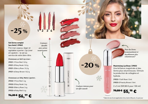 1 2 3 41234-20 %-25 %70,58 %u20ac 55,98 %u20ac76,38 %u20ac 56,99 %u20ac2 x 5 ml (559,80 %u20ac pour 100 ml)Une brillance magistrale et des l%u00e8vres plus volumineuses. Stimule la production de collag%u00e8ne et hydrate.29033-1 Soft Rose I 5ml29033-2 Peachy Brown I 5mlMaximising Lip Gloss |%u00a029033Fini mat-soyeux, l%u00e9ger et agr%u00e9able %u00e0 porter. Lip Liner et Lipstick %u2013 le set au service de votre bien-%u00eatre.Choisissez un Soft Lip Liner%u00a0:29031-1 Pure Red |%u00a00,2g29031-2 Rosy Nude |%u00a00,2g 29031-3 Berry Rose |%u00a00,2g29031-4 Deep Brown I 0,2 g Choisissez un Silky Matte Lipstick%u00a0:29032-1 Pure Red |%u00a04g29032-2 Rosy Nude |%u00a04g29032-3 Berry Rose |%u00a04g29032-4 Ruby Red I 4 gSet l%u00e8vres complet(au choix) |%u00a029045* Dans le cas d%u2019une application d%u2019au moins 28%u00a0jours, 3x par jourPour des l%u00e8vres instantan%u00e9ment et durablement plus volumineuses*Contours durable avec action nourrissanteCouleurs intenses pour un effet waouh