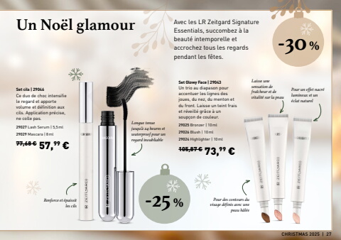 CHRISTMAS 2025 | 27-25 %-30 %105,87 %u20ac 73,99 %u20ac77,68 %u20ac 57,99 %u20acUn trio au diapason pour accentuer les lignes des joues, du nez, du menton et du front. Laisse un teint frais et r%u00e9veill%u00e9 gr%u00e2ce %u00e0 un soup%u00e7on de couleur.29025 Bronzer |%u00a010ml29026 Blush |%u00a010ml29024 Highlighter |%u00a010ml Set Glowy Face |%u00a029043Ce duo de choc intensifie le regard et apporte volume et d%u00e9finition aux cils. Application pr%u00e9cise, ne colle pas.29027 Lash Serum |%u00a05,5ml29029 Mascara |%u00a08mlSet cils | 29046Avec les LR Zeitgard Signature Essentials, succombez %u00e0 la beaut%u00e9 intemporelle et accrochez tous les regards pendant les f%u00eates.Un No%u00ebl glamourPour un effet nacr%u00e9 lumineux et un %u00e9clat naturelLaisse une sensation de fra%u00eecheur et de vitalit%u00e9 sur la peauPour des contours du visage d%u00e9finis avec une peau h%u00e2l%u00e9eRenforce et %u00e9paissit les cilsLongue tenue jusqu%u2019%u00e0 24 heures et waterproof pour un regard inoubliable