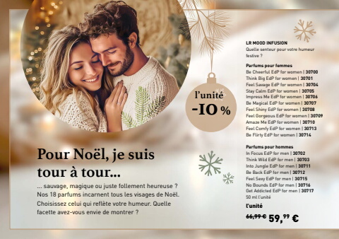 -10 %66,99 %u20ac 59,99 %u20ac50 ml l%u2019unit%u00e9l%u2019unit%u00e9LR MOOD INFUSIONParfums pour femmesBe Cheerful EdP for women |%u00a030700Think Big EdP for women |%u00a030701Feel Savage EdP for women |%u00a030704Stay Calm EdP for women |%u00a030705Impress Me EdP for women |%u00a030706Be Magical EdP for women |%u00a030707Feel Shiny EdP for women |%u00a030708Feel Gorgeous EdP for women |%u00a030709Amaze Me EdP for women |%u00a030710Feel Comfy EdP for women |%u00a030713Be Flirty EdP for women |%u00a030714Parfums pour hommesIn Focus EdP for men |%u00a030702Think Wild EdP for men |%u00a030703Into Jungle EdP for men |%u00a030711Be Back EdP for men |%u00a030712Feel Sexy EdP for men |%u00a030715No Bounds EdP for men |%u00a030716Get Addicted EdP for men |%u00a030717l%u2019unit%u00e9... sauvage, magique ou juste follement heureuse%u00a0? Nos 18%u00a0parfums incarnent tous les visages de No%u00ebl. Choisissez celui qui refl%u00e8te votre humeur. Quelle facette avez-vous envie de montrer%u00a0?Pour No%u00ebl, je suis tour %u00e0 tour...Quelle senteur pour votre humeur festive%u00a0?