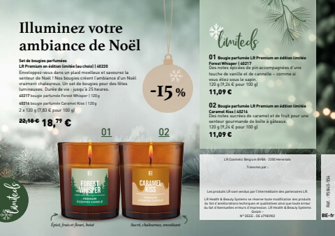 limiteds limiteds01 02-15 %120 g (9,24 %u20ac pour 100 g)11,09 %u20ac120 g (9,24 %u20ac pour 100 g)11,09 %u20ac22,18 %u20ac 18,79 %u20ac2 x 120 g (7,83 %u20ac pour 100 g)010240217 bougie parfum%u00e9e Forest Whisper |%u00a0120g40216 bougie parfum%u00e9e Caramel Kiss |%u00a0120g Bougie parfum%u00e9e LR Premium en %u00e9dition limit%u00e9e Caramel Kiss |%u00a040216Set de bougies parfum%u00e9esLR Premium en %u00e9dition limit%u00e9e (au choix) | 40220Des notes sucr%u00e9es de caramel et de fruit pour une senteur gourmande de bo%u00eete %u00e0 g%u00e2teaux.Des notes %u00e9pic%u00e9es de pin accompagn%u00e9es d%u2019une touche de vanille et de cannelle %u2013 comme si vous %u00e9tiez sous le sapin.Bougie parfum%u00e9e LR Premium en %u00e9dition limit%u00e9e Forest Whisper |%u00a040217Enveloppez-vous dans un plaid moelleux et savourez la senteur de No%u00ebl%u00a0! Nos bougies cr%u00e9ent l%u2019ambiance d%u2019un No%u00ebl vraiment chaleureux. Un set de bougies pour des f%u00eates lumineuses. Dur%u00e9e de vie%u00a0: jusqu%u2019%u00e0 25 heures.%u00c9pic%u00e9, frais et fleuri, bois%u00e9 Sucr%u00e9, chaleureux, envo%u00fbtantIlluminez votre ambiance de No%u00eblBE-frR%u00e9f.%u00a0: 95840-554LR Cosmetic Belgium BVBA %u00b7 2200 HerentalsTransmis par%u00a0:Les produits LR sont vendus par l%u2019interm%u00e9diaire des partenaires LR.LR Health & Beauty Systems se r%u00e9serve toute modification des produits du fait d%u2019am%u00e9liorations techniques et qualitatives ainsi que toute erreur du fait d%u2019%u00e9ventuelles erreurs d%u2019impression. LR Health & Beauty Systems GmbH %u2013N%u00b0 DEEE%u00a0: DE 47983902