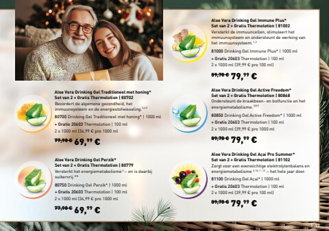 2 x 1000 ml (34,99 %u20ac pro 1000 ml2 x 1000 ml (34,99 %u20ac pro 1000 ml2 x 1000 ml (39,99 %u20ac pro 100 ml)2 x 1000 ml (39,99 %u20ac pro 1000 ml2 x 1000 ml (39,99 %u20ac pro 100 ml)77,98 %u20ac 69,99 %u20ac77,98 %u20ac 69,99 %u20ac89,78 %u20ac 79,99 %u20ac89,78 %u20ac 79,99 %u20ac89,78 %u20ac 79,99 %u20acZorgt voor een evenwichtige elektrolytenbalans en energiemetabolisme 3,10,11,12%u00a0%u2013 het hele jaar door.81100 Drinking Gel A%u00e7ai* |%u00a01000 ml+ Gratis 20603 Thermolotion |%u00a0100 mlAloe Vera Drinking Gel A%u00e7ai Pro Summer* Set van 2 + Gratis Thermolotion |%u00a081102Ondersteunt de kraakbeen- en botfunctie en het energiemetabolisme. 3,8,980850 Drinking Gel Active Freedom* |%u00a01000 ml+ Gratis 20603 Thermolotion |%u00a0100 mlAloe Vera Drinking Gel Active Freedom*Set van 2 + Gratis Thermolotion |%u00a080868Versterkt de immuuncellen, stimuleert het immuunsysteem en ondersteunt de werking van het immuunsysteem. 1,281000 Drinking Gel Immune Plus* |%u00a01000 ml+ Gratis 20603 Thermolotion |%u00a0100 mlAloe Vera Drinking Gel Immune Plus*Set van 2 + Gratis Thermolotion |%u00a081002Versterkt het energiemetabolisme3%u00a0%u2013 en is daarbij suikervrij.**80750 Drinking Gel Perzik* |%u00a01000 ml+ Gratis 20603 Thermolotion |%u00a0100 mlAloe Vera Drinking Gel Perzik* Set van 2 + Gratis Thermolotion |%u00a080779Bevordert de algemene gezondheid, het immuunsysteem en de energiestofwisseling.3,4,580700 Drinking Gel Traditioneel met honing* |%u00a01000 ml+ Gratis 20603 Thermolotion |%u00a0100 mlAloe Vera Drinking Gel Traditioneel met honing*Set van 2 + Gratis Thermolotion |%u00a080702I 19