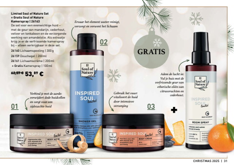 010203 +CHRISTMAS 2025 | 3162,57 %u20ac 53,89 %u20acGRATISDe set voor een evenwichtige huid%u00a0%u2013 met de geur van mandarijn, cederhout, vetiver en tonkaboon en de verzorgende werking van amandelolie. Als extraatje krijg je er de verfrissende kamerspray bij%u00a0%u2013 alleen verkrijgbaar in deze set.26160 Lichaamspeeling |%u00a0300g26159 Douchegel |%u00a0200ml26161 Lichaamscr%u00e8me |%u00a0200ml + Gratis Kamerspray |%u00a0100mlLimited Soul of Nature Set+ Gratis Soul of Nature Kamerspray |%u00a026163Adem de lucht in: Vul je huis met de verfrissende geur van etherische oli%u00ebn van citrusvruchten en cederhout. Gebruik het vuur: vitaliseert de huid door intensieve verzorgingErvaar het element water: reinigt, verzorgt en verwent het lichaamVerbind je met de aarde: verwijdert dode huidcellen en zorgt voor een zijdezachte huid