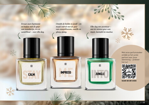 I 33SCAN DE QR CODEMet onze parfumzoeker ontdek je het juiste parfum voor jouw stemming%u00a0%u2013 probeer het nu!Ervaar pure harmonie en balans met de geur van mandarijn, iris en sandelhout %u2013 voor elke dag.Ontdek de heldin in jezelf %u2013 en maak indruk met de geur van oranjebloesem, vanille en ylang-ylang.Elke dag een avontuur %u2013 met de intense geur van munt, lavendel en muskus