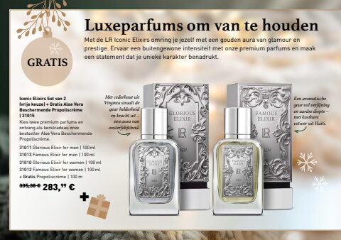 +335,38 %u20ac 283,99 %u20acKies twee premium parfums en ontvang als kerstcadeau onze bestseller Aloe Vera Beschermende Propoliscr%u00e8me.31011 Glorious Elixir for men |%u00a0100ml31013 Famous Elixir for men |%u00a0100ml31010 Glorious Elixir for women |%u00a0100ml 31012 Famous Elixir for women |%u00a0100ml+ Gratis Propoliscr%u00e8me |%u00a0100 mIconic Elixirs Set van 2(vrije keuze) + Gratis Aloe Vera Beschermende Propoliscr%u00e8me |%u00a031015Met de LR Iconic Elixirs omring je jezelf met een gouden aura van glamour en prestige. Ervaar een buitengewone intensiteit met onze premium parfums en maak een statement dat je unieke karakter benadrukt.Luxeparfums om van te houdenGRATISEen aromatische geur vol verfijning en aardse diepte %u2013 met kostbare vetiver uit Ha%u00efti.Met cederhout uit Virginia straalt de geur helderheid en kracht uit %u2013 een aura van onsterfelijkheid.