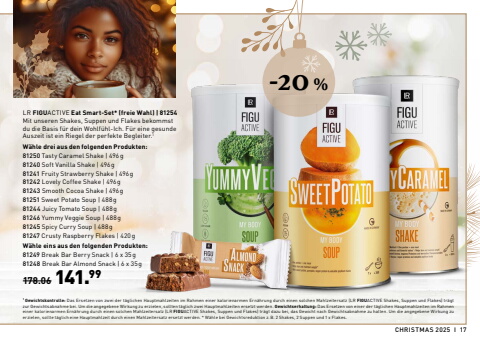 CHRISTMAS 2025 I 171 Gewichtskontrolle: Das Ersetzen von zwei der t%u00e4glichen Hauptmahlzeiten im Rahmen einer kalorienarmen Ern%u00e4hrung durch einen solchen Mahlzeitersatz (LR FIGUACTIVE Shakes, Suppen und Flakes) tr%u00e4gt zur Gewichtsabnahme bei. Um die angegebene Wirkung zu erzielen, sollten t%u00e4glich zwei Hauptmahlzeiten ersetzt werden. Gewichtserhaltung: Das Ersetzen von einer der t%u00e4glichen Hauptmahlzeiten im Rahmen einer kalorienarmen Ern%u00e4hrung durch einen solchen Mahlzeitersatz (LR FIGUACTIVE Shakes, Suppen und Flakes) tr%u00e4gt dazu bei, das Gewicht nach Gewichtsabnahme zu halten. Um die angegebene Wirkung zu erzielen, sollte t%u00e4glich eine Hauptmahlzeit durch einen Mahlzeitersatz ersetzt werden. * W%u00e4hle bei Gewichtsreduktion z.B. 2 Shakes, 2 Suppen und 1 x Flakes.LR FIGUACTIVE Eat Smart-Set* (freie Wahl) | 81254 Mit unseren Shakes, Suppen und Flakes bekommst du die Basis f%u00fcr dein Wohlf%u00fchl-Ich. F%u00fcr eine gesunde Auszeit ist ein Riegel der perfekte Begleiter.1W%u00e4hle drei aus den folgenden Produkten: 81250 Tasty Caramel Shake | 496g81240 Soft Vanilla Shake | 496g81241 Fruity Strawberry Shake | 496g81242 Lovely Coffee Shake | 496g81243 Smooth Cocoa Shake | 496g81251 Sweet Potato Soup | 488g81244 Juicy Tomato Soup | 488g81246 Yummy Veggie Soup | 488g81245 Spicy Curry Soup | 488g81247 Crusty Raspberry Flakes | 420gW%u00e4hle eins aus den folgenden Produkten:81249 Break Bar Berry Snack | 6 x 35g81248 Break Bar Almond Snack | 6 x 35g178.06 141.99-20 %