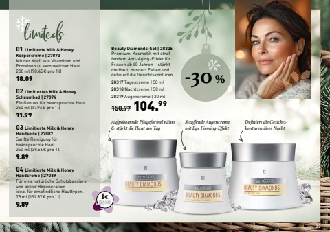 limiteds 2301 Limitierte Milk & Honey K%u00f6rpercreme | 27073Mit der Kraft aus Vitaminen und Proteinen zu samtweicher Haut.200 ml (90.45%u20ac pro 1l)18.0902 Limitiertes Milk & Honey Schaumbad | 27074Ein Genuss f%u00fcr beanspruchte Haut.250 ml (47.96%u20ac pro 1l)11.9903 Limitierte Milk & Honey Handseife | 27087Sanfte Reinigung f%u00fcr beanspruchte Haut.250 ml (39.56%u20ac pro 1l)9.8904 Limitierte Milk & Honey Handcreme | 27089F%u00fcr eine nat%u00fcrliche Schutzbarriere und aktive Regeneration %u2013 ideal f%u00fcr empfindliche Hauttypen.75 ml (131.87%u20ac pro 1l)9.891%u20acBeauty Diamonds-Set | 28325Premium-Kosmetik mit straffendem Anti-Aging-Effekt f%u00fcr Frauen ab 40 Jahren %u2013 st%u00e4rkt die Haut, mindert Falten und definiert die Gesichtskonturen. 28317 Tagescreme | 50 ml28318 Nachtcreme | 50 ml28319 Augencreme | 30 ml150.97 104.99Aufpolsternde Pflegeformel n%u00e4hrt & st%u00e4rkt die Haut am TagStraffende Augencreme mit Eye Firming-EffektDefiniert die Gesichtskonturen %u00fcber Nacht-30 %