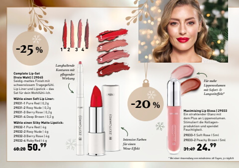 1 2 3 4123Complete Lip-Set 4(freie Wahl) | 29045 Seidig-mattes Finish mit schwerelosem Tragegef%u00fchl. Lip Liner und Lipstick %u2013 das Set f%u00fcr dein Wohlf%u00fchl-Ich.W%u00e4hle einen Soft Lip Liner:29031-1 Pure Red | 0,2g29031-2 Rosy Nude | 0,2g29031-3 Berry Rose | 0,2g29031-4 Deep Brown I 0,2 gW%u00e4hle einen Silky Matte Lipstick:29032-1 Pure Red | 4g29032-2 Rosy Nude | 4g29032-3 Berry Rose | 4g29032-4 Ruby Red I 4 g68.28 50.99Intensive Farben f%u00fcr einen Wow-EffektLanghaltende Konturen mit pflegender WirkungMaximising Lip Gloss | 29033Ein strahlender Glanz mit dem Plus an Lippenvolumen. Stimuliert die Kollagenproduktion und spendet Feuchtigkeit.29033-1 Soft Rose I 5ml29033-2 Peachy Brown I 5ml31.49 24.99F%u00fcr mehr Lippenvolumen mit Sofort- & Langzeiteffekt** Bei einer Anwendung von mindestens 28 Tagen, 3 x t%u00e4glich-25 %-20 %