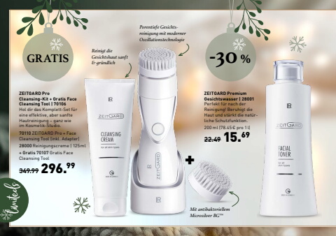 limiteds+Reinigt die Gesichtshaut sanft & gr%u00fcndlichPorentiefe Gesichtsreinigung mit moderner OszillationstechnologieZEITGARD Pro Cleansing-Kit + Gratis Face Cleansing Tool | 70106Hol dir das Komplett-Set f%u00fcr eine effektive, aber sanfte Hautreinigung %u2013 ganz wie im Kosmetik-Studio.70110 ZEITGARD Pro + Face Cleansing Tool (inkl. Adapter)28000 Reinigungscreme | 125ml+ Gratis 70107 Gratis Face Cleansing Tool 349.99 296.99ZEITGARD Premium Gesichtswasser | 28001Perfekt f%u00fcr nach der Reinigung! Beruhigt die Haut und st%u00e4rkt die nat%u00fcrliche Schutzfunktion.200 ml (78.45%u20ac pro 1l)22.49 15.69Mit antibakteriellem Microsilver BG%u2122GRATIS -30 %