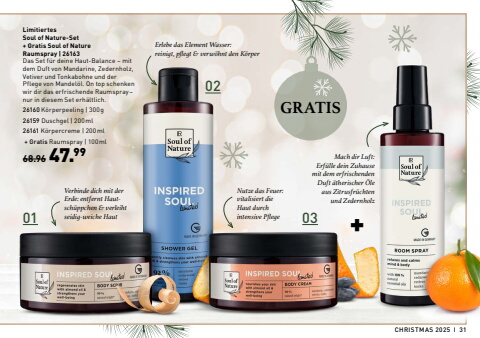 010203 +CHRISTMAS 2025 I 31Limitiertes Soul of Nature-Set + Gratis Soul of Nature Raumspray | 26163Das Set f%u00fcr deine Haut-Balance %u2013 mit dem Duft von Mandarine, Zedernholz, Vetiver und Tonkabohne und der Pflege von Mandel%u00f6l. On top schenken wir dir das erfrischende Raumspray %u2013 nur in diesem Set erh%u00e4ltlich.26160 K%u00f6rperpeeling | 300g26159 Duschgel | 200ml26161 K%u00f6rpercreme | 200ml + Gratis Raumspray | 100ml68.96 47.99Verbinde dich mit der Erde: entfernt Hautsch%u00fcppchen & verleiht seidig-weiche HautErlebe das Element Wasser: reinigt, pflegt & verw%u00f6hnt den K%u00f6rperNutze das Feuer: vitalisiert die Haut durch intensive PflegeMach dir Luft: Erf%u00fclle dein Zuhause mit dem erfrischenden Duft %u00e4therischer %u00d6le aus Zitrusfr%u00fcchten und ZedernholzGRATIS