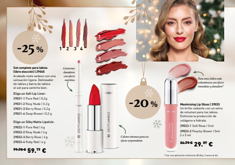 1 2 3 41234-20 %-25 %2 x 5 ml 79.78 %u20ac 59.79 %u20ac36.79 %u20ac 29.89 %u20acColores intensos para un efecto sorprendenteContornos duraderos con efecto nutritivo Para unos labios m%u00e1s voluminosos con efecto inmediato y duradero** Con una aplicaci%u00f3n m%u00ednima de 28 d%u00edas, 3 veces al d%u00edaSet completo para labios(libre elecci%u00f3n) |%u00a029045Elige un Soft Lip Liner:29031-1 Pure Red |%u00a00,2g29031-2 Rosy Nude |%u00a00,2g29031-3 Berry Rose |%u00a00,2g29031-4 Deep Brown I 0,2 g Elige un Silky Matte Lipstick:29032-1 Pure Red |%u00a04g29032-2 Rosy Nude |%u00a04g29032-3 Berry Rose |%u00a04g29032-4 Ruby Red I 4 gAcabado mate sedoso con una sensaci%u00f3n ligera. Delineador de labios y barra de labios: el%u00a0set para sentirte bien.Maximising Lip Gloss |%u00a02903329033-1 Soft Rose I 5ml29033-2 Peachy Brown I 5mlUn brillo radiante con un extra de volumen para los labios. Estimula la producci%u00f3n de col%u00e1geno e hidrata.