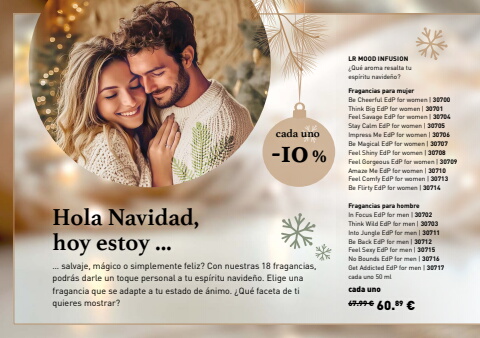 -10 %67.99 %u20ac 60.89 %u20ac%u00bfQu%u00e9 aroma resalta tu esp%u00edritu navide%u00f1o?Hola Navidad, hoy estoy ...%u2026 salvaje, m%u00e1gico o simplemente feliz? Con nuestras 18 fragancias, podr%u00e1s darle un toque personal a tu esp%u00edritu navide%u00f1o. Elige una fragancia que se adapte a tu estado de %u00e1nimo. %u00bfQu%u00e9 faceta de ti quieres mostrar?cada unoFragancias para mujerBe Cheerful EdP for women |%u00a030700Think Big EdP for women |%u00a030701Feel Savage EdP for women |%u00a030704Stay Calm EdP for women |%u00a030705Impress Me EdP for women |%u00a030706Be Magical EdP for women |%u00a030707Feel Shiny EdP for women |%u00a030708Feel Gorgeous EdP for women |%u00a030709Amaze Me EdP for women |%u00a030710Feel Comfy EdP for women |%u00a030713Be Flirty EdP for women |%u00a030714Fragancias para hombreIn Focus EdP for men |%u00a030702Think Wild EdP for men |%u00a030703Into Jungle EdP for men |%u00a030711Be Back EdP for men |%u00a030712Feel Sexy EdP for men |%u00a030715No Bounds EdP for men |%u00a030716Get Addicted EdP for men |%u00a030717LR MOOD INFUSIONcada unocada uno 50 ml