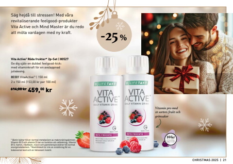 CHRISTMAS 2025 | 21-25 %2 x 150 ml (153,00 kr per 100 ml)614,00 kr 459,00 krVita Active2 R%u00f6da frukter* 2p-Set |%u00a0805272 Biotin bidrar till en normal metabolism av makron%u00e4rings%u00e4mnen. Vitamin B12 och vitamin D har en funktion vid celldelning. Vitamin B12, tiamin, riboflavin, niacin och pantotensyra bidrar till normal energimetabolism. *Kosttillskott %u00e4r inte en ers%u00e4ttning f%u00f6r en balanserad kost och en h%u00e4lsosam livsstil.Vitamin pro med 21 sorters frukt och gr%u00f6nsakerS%u00e4g hejd%u00e5 till stressen! Med v%u00e5ra revitaliserande feelgood-produkter Vita Active och Mind Master %u00e4r du redo att m%u00f6ta vardagen med ny kraft.80301 VitaActive*2 |%u00a0150 mlGe dig sj%u00e4lv en dubbel feelgood-kick: med vitaminkraft f%u00f6r en avslappnad juls%u00e4song.10 kr