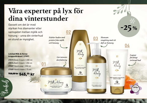 limiteds01020304-25 %728,00 kr 545,00 krSt%u00e4rker huden med protein fr%u00e5n mj%u00f6lk och honungGer intensiv %u00e5terfuktning Skonsam reng%u00f6ring med s%u00f6t doft av honungLugnar f%u00f6rsiktigt irriterad hudV%u00e5ra experter p%u00e5 lyx f%u00f6r dina vinterstunderOavsett om det %u00e4r med styrkan hos diamanter eller samspelet mellan mj%u00f6lk och honung %u2013 unna din vinterhud en stund av mysighet. Limited Milk & Honey kroppsv%u00e5rdsset |%u00a02709127073 Body Cream |%u00a0200 ml27074 Bath Cream |%u00a0250 ml27087 Hand soap |%u00a0250 ml27089 Hand cream |%u00a075 ml10 kr
