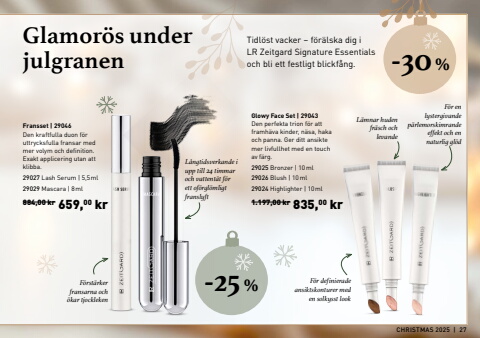 CHRISTMAS 2025 | 27-25 %-30 %884,00 kr 659,00 kr 1.197,00 kr 835,00 krL%u00e5ngtidsverkande i upp till 24 timmar och vattent%u00e4t f%u00f6r ett of%u00f6rgl%u00f6mligt franslyftF%u00f6rst%u00e4rker fransarna och %u00f6kar tjocklekenF%u00f6r definierade ansiktskonturer med en solkysst lookL%u00e4mnar huden fr%u00e4sch och levandeF%u00f6r en lystergivande p%u00e4rlemorskimrande effekt och en naturlig gl%u00f6dGlamor%u00f6s under julgranenTidl%u00f6st vacker %u2013 f%u00f6r%u00e4lska dig i LR%u00a0Zeitgard Signature Essentials och bli ett festligt blickf%u00e5ng.Fransset |%u00a02904629027 Lash Serum |%u00a05,5ml29029 Mascara |%u00a08mlDen kraftfulla duon f%u00f6r uttrycksfulla fransar med mer volym och definition. Exakt applicering utan att klibba.Glowy Face Set |%u00a02904329025 Bronzer |%u00a010ml29026 Blush |%u00a010ml29024 Highlighter |%u00a010ml Den perfekta trion f%u00f6r att framh%u00e4va kinder, n%u00e4sa, haka och panna. Ger ditt ansikte mer livfullhet med en touch av f%u00e4rg.
