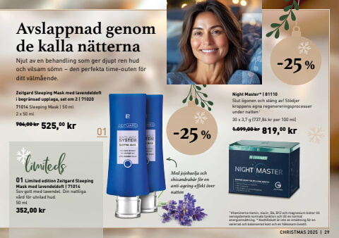 limiteds01CHRISTMAS 2025 | 29-25 %-25 %2 x 50 ml30 x 3,7 g (737,84 kr per 100 ml)50 ml 352,00 kr1.099,00 kr 819,00 kr704,00 kr 525,00 kr011 Vitaminerna tiamin, niacin, B6, B12 och magnesium bidrar till nervsystemets normala funktion och till en normal energioms%u00e4ttning. * Kosttillskott %u00e4r inte en ers%u00e4ttning f%u00f6r en varierad och balanserad kost och en h%u00e4lsosam livsstil.Med jojobaolja och shizandrab%u00e4r f%u00f6r en anti-ageing-effekt %u00f6ver nattenAvslappnad genom de kalla n%u00e4tternaNjut av en behandling som ger djupt ren hud och vilsam s%u00f6mn %u2013 den perfekta time-outen f%u00f6r ditt v%u00e4lm%u00e5ende.Sov gott med lavendel. Din nattliga v%u00e5rd f%u00f6r utvilad hud.Limited edition Zeitgard Sleeping Mask med lavendeldoft |%u00a071014Zeitgard Sleeping Mask med lavendeldoft i begr%u00e4nsad upplaga, set om 2 |%u00a07102071014 Sleeping Mask |%u00a050 mlNight Master* |%u00a081110Slut %u00f6gonen och st%u00e4ng av! St%u00f6djer kroppens egna regenereringsprocesser under natten.1