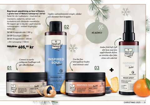 010203 +CHRISTMAS 2025 | 31703,00 kr 605,00 krConnect to earth: avl%u00e4gsnar hudflagor och ger silkeslen hudUpplev vattenelementet: reng%u00f6r, v%u00e5rdar och sk%u00e4mmer bort kroppenUse the fire: %u00e5terupplivar huden med intensiv v%u00e5rdAndas frisk luft: fyll ditt hem med den uppfriskande doften av eteriska oljor fr%u00e5n citrus och cedertr%u00e4Begr%u00e4nsad upps%u00e4ttning av Soul of Nature+ gratis Soul of Nature rumsspray |%u00a02616326160 Kroppsskrubb |%u00a0300 g26159 Duschgel |%u00a0200ml26161 Kroppskr%u00e4m |%u00a0200ml + fri rumsspray |%u00a0100mlSetet f%u00f6r din hudbalans %u2013 med doft av mandarin, cedertr%u00e4, vetiver och tonkab%u00f6na och v%u00e5rdande mandelolja. P%u00e5 toppen ger vi dig den uppfriskande rumssprayen %u2013 endast tillg%u00e4nglig i detta set.P%u00c5 K%u00d6PET