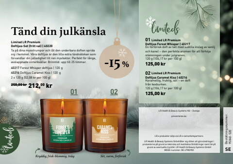 limiteds limiteds01 02-15 %2 x 120 g (52,08 kr per 100 g)250,00 kr 212,00 kr120 g (104,17 kr per 100 g)125,00 kr120 g (104,17 kr per 100 g)125,00 kr0102Limited LR%u00a0PremiumDoftljus Forest Whisper |%u00a040217 Limited LR%u00a0PremiumDoftljus-Set (fritt val) |%u00a040220Limited LR%u00a0PremiumDoftljus Caramel Kiss |%u00a040216LR Health & Beauty Systems AB %u2013 Sverigepresenteras av:LR:s produkter s%u00e4ljs via LR:s samarbetspartners.LR Health & Beauty Systems f%u00f6rbeh%u00e5ller sig r%u00e4tten att g%u00f6ra %u00e4ndringar i produkterna p%u00e5 grund av tekniska och kvalitativa f%u00f6rb%u00e4ttringar samt fel p%u00e5 grund av eventuella tryckfel. LR%u00a0Health & Beauty Systems GmbHWEEE-nummer: DE 47983902Best%u00e4llningsnummer: 95840-520SET%u00e4nd din julk%u00e4nslaKryddig, frisk-blommig, tr%u00e4ig S%u00f6t, varm, f%u00f6rf%u00f6riskTa p%u00e5 dina mysstrumpor och l%u00e5t den underbara doften sprida sig i hemmet. V%u00e5ra doftljus %u00e4r den lilla extra t%u00e4ndv%u00e4tskan som f%u00f6rvandlar din julledighet till ren mysfaktor. Perfekt f%u00f6r l%u00e5nga, avslappnade vinterkv%u00e4llar. Brinntid: upp till 25 timmar.En f%u00f6rf%u00f6risk doft av tall med subtila inslag av vanilj och kanel %u2013 den perfekta aromen f%u00f6r att f%u00f6rh%u00f6ja st%u00e4mningen under julgranen.Karamellig, fruktig, s%u00f6t %u2013 en doft fr%u00e5n kexburken.40217 Forest Whisper doftljus |%u00a0120 g40216 Doftljus Caramel Kiss |%u00a0120 g