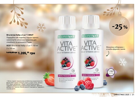 CHRISTMAS 2025 | 21-25 %2 x 150 %u043c%u043b 1.610,00 %u0433%u0440%u043d 1.205,00 %u0433%u0440%u043d2 %u0411%u0456%u043e%u0442%u0438%u043d %u0441%u043f%u0440%u0438%u044f%u0454 %u043d%u043e%u0440%u043c%u0430%u043b%u044c%u043d%u043e%u043c%u0443 %u043c%u0435%u0442%u0430%u0431%u043e%u043b%u0456%u0437%u043c%u0443 %u043c%u0430%u043a%u0440%u043e%u0435%u043b%u0435%u043c%u0435%u043d%u0442%u0456%u0432. %u0412%u0456%u0442%u0430%u043c%u0456%u043d %u041212 %u0456 %u0432%u0456%u0442%u0430%u043c%u0456%u043d D %u0431%u0435%u0440%u0443%u0442%u044c %u0443%u0447%u0430%u0441%u0442%u044c %u0443 %u043f%u043e%u0434%u0456%u043b%u0456 %u043a%u043b%u0456%u0442%u0438%u043d. %u0412%u0456%u0442%u0430%u043c%u0456%u043d B12, %u0442%u0456%u0430%u043c%u0456%u043d, %u0440%u0438%u0431%u043e%u0444%u043b%u0430%u0432%u0456%u043d, %u043d%u0456%u0430%u0446%u0438%u043d %u0456 %u043f%u0430%u043d%u0442%u043e%u0442%u0435%u043d%u043e%u0432%u0430 %u043a%u0438%u0441%u043b%u043e%u0442%u0430 %u0441%u043f%u0440%u0438%u044f%u044e%u0442%u044c %u043d%u043e%u0440%u043c%u0430%u043b%u044c%u043d%u043e%u043c%u0443 %u0435%u043d%u0435%u0440%u0433%u0435%u0442%u0438%u0447%u043d%u043e%u043c%u0443 %u043e%u0431%u043c%u0456%u043d%u043e%u0432%u0456. *%u0414%u0456%u0454%u0442%u0438%u0447%u043d%u0456 %u0434%u043e%u0431%u0430%u0432%u043a%u0438 %u043d%u0435 %u0454 %u0437%u0430%u043c%u0456%u043d%u043e%u044e %u0437%u0431%u0430%u043b%u0430%u043d%u0441%u043e%u0432%u0430%u043d%u043e%u0433%u043e %u0445%u0430%u0440%u0447%u0443%u0432%u0430%u043d%u043d%u044f %u0456 %u0437%u0434%u043e%u0440%u043e%u0432%u043e%u0433%u043e %u0441%u043f%u043e%u0441%u043e%u0431%u0443 %u0436%u0438%u0442%u0442%u044f.%u0412%u0456%u0442%u0430%u043c%u0456%u043d%u043d%u0430 %u043f%u0456%u0434%u0442%u0440%u0438%u043c%u043a%u0430 %u0437 21 %u0432%u0438%u0434%u043e%u043c %u0444%u0440%u0443%u043a%u0442%u0456%u0432 %u0456 %u043e%u0432%u043e%u0447%u0456%u0432%u0412%u0456%u0442%u0430 %u0410%u043a%u0442%u0438%u0432 %u041d%u0430%u0431%u0456%u0440 %u0437 2 %u0448%u0442.* |%u00a08052780301 %u0412%u0456%u0442%u0430 %u0410%u043a%u0442%u0438%u0432 %u041d%u0430%u0431%u0456%u0440 %u0437 2 %u0448%u0442.*|%u00a0150 %u043c%u043b%u041f%u043e%u0434%u0430%u0440%u0443%u0439%u0442%u0435 %u0441%u043e%u0431%u0456 %u043f%u043e%u0434%u0432%u0456%u0439%u043d%u0443 %u043f%u043e%u0440%u0446%u0456%u044e %u0433%u0430%u0440%u043d%u043e%u0433%u043e %u0441%u0430%u043c%u043e%u043f%u043e%u0447%u0443%u0442%u0442%u044f: %u0432%u0456%u0442%u0430%u043c%u0456%u043d%u043d%u0430 %u043f%u0456%u0434%u0442%u0440%u0438%u043c%u043a%u0430 %u0434%u043b%u044f %u0441%u043f%u043e%u043a%u0456%u0439%u043d%u043e%u0433%u043e %u0442%u0430 %u0437%u0430%u0442%u0438%u0448%u043d%u043e%u0433%u043e %u0420%u0456%u0437%u0434%u0432%u0430.1 %u0454%u0432%u0440%u043e