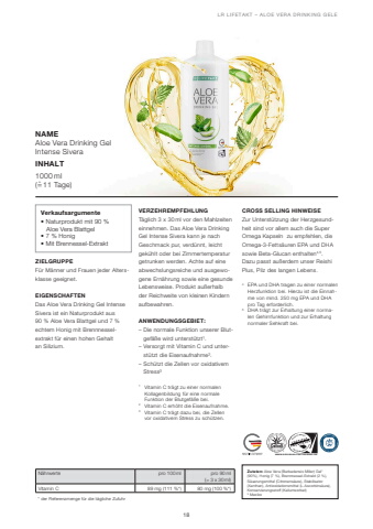 18GESUNDHEIT & ERN%u00c4HRUNGZIELGRUPPEF%u00fcr M%u00e4nner und Frauen jeder Altersklasse geeignet. EIGENSCHAFTENDas Aloe Vera Drinking Gel Intense Sivera ist ein Naturprodukt aus 90 % Aloe Vera Blattgel und 7 % echtem Honig mit Brennnesselextrakt f%u00fcr einen hohen Gehalt an Silizium. VERZEHREMPFEHLUNGT%u00e4glich 3 x 30 ml vor den Mahlzeiten einnehmen. Das Aloe Vera Drinking Gel Intense Sivera kann je nach Geschmack pur, verd%u00fcnnt, leicht gek%u00fchlt oder bei Zimmertemperatur getrunken werden. Achte auf eine abwechslungsreiche und ausgewogene Ern%u00e4hrung sowie eine gesunde Lebensweise. Produkt au%u00dferhalb der Reichweite von kleinen Kindern aufbewahren. ANWENDUNGSGEBIET:%u2013 Die normale Funktion unserer Blutgef%u00e4%u00dfe wird unterst%u00fctzt%u00b9.%u2013 Versorgt mit Vitamin C und unterst%u00fctzt die Eisenaufnahme%u00b2.%u2013 Sch%u00fctzt die Zellen vor oxidativem Stress%u00b31 Vitamin C tr%u00e4gt zu einer normalen Kollagenbildung f%u00fcr eine normale Funktion der Blutgef%u00e4%u00dfe bei. 2 Vitamin C erh%u00f6ht die Eisenaufnahme. 3 Vitamin C tr%u00e4gt dazu bei, die Zellen vor oxidativem Stress zu sch%u00fctzen.CROSS SELLING HINWEISEZur Unterst%u00fctzung der Herzgesundheit sind vor allem auch die Super Omega Kapseln zu empfehlen, die Omega-3-Fetts%u00e4uren EPA und DHA sowie Beta-Glucan enthalten4,5. Dazu passt au%u00dferdem unser Reishi Plus, Pilz des langen Lebens.4 EPA und DHA tragen zu einer normalen Herzfunktion bei. Hierzu ist die Einnahme von mind. 250 mg EPA und DHA pro Tag erforderlich. 5 DHA tr%u00e4gt zur Erhaltung einer normalen Gehirnfunktion und zur Erhaltung normaler Sehkraft bei.NAMEAloe Vera Drinking Gel Intense SiveraINHALT1000 ml (=%u02c6 11 Tage)Zutaten: Aloe Vera (Barbadensis Miller) Gel1(90%), Honig (7 %), Brennnessel-Extrakt (2 %), S%u00e4uerungsmittel (Citronens%u00e4ure), Stabilisator (Xanthan), Antioxidationsmittel (L-Ascorbins%u00e4ure), Konservierungsstoff (Kaliumsorbat)1 MexikoVerkaufsargumente%u2022 Naturprodukt mit 90 % Aloe Vera Blattgel %u2022 7 % Honig%u2022 Mit Brennessel-ExtraktN%u00e4hrwerte pro 100ml pro 90ml (= 3 x 30ml)Vitamin C 89 mg (111 %*) 80 mg (100 %*)* der Referenzmenge f%u00fcr die t%u00e4gliche ZufuhrWWW.SGS-QUALITAETSSIEGEL.DELR LIFETAKT %u2013 ALOE VERA DRINKING GELE