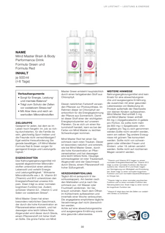 30GESUNDHEIT & ERN%u00c4HRUNGNAMEMind Master Brain & BodyPerformance DrinkFormula Green undFormula RedINHALTje 500 ml(=%u02c6 6 Tage)Verkaufsargumente%u2022 Sorgt f%u00fcr Energie, Leistung1und mentale Balance2%u2022 Tr%u00e4gt zum Schutz der Zellenvor oxidativem Stress bei3%u2022 Mit Aloe Vera und reich an wertvollen Mikron%u00e4hrstoffen WWW.SGS-QUALITAETSSIEGEL.DELR LIFETAKT %u2013 LEISTUNG & ENERGIEZIELGRUPPEGeeignet f%u00fcr jeden, bei dem es im Leben hoch hergeht: Im Job so richtig durchstarten, f%u00fcr die Familie da sein, gleichzeitig Sport treiben und die Freunde nicht vernachl%u00e4ssigen? Egal welche Herausforderung Sie gerade bew%u00e4ltigen, LR Mind Master Formula Red & Green sorgen f%u00fcr gen%u00fcgend Energie und Leistungsf%u00e4higkeit.1EIGENSCHAFTENDas Nahrungserg%u00e4nzungsmittel mit speziell abgestimmten Mikron%u00e4hrstoffen unterst%u00fctzt einen aktiven Lebensstil und verleiht Energie und Leistungsf%u00e4higkeit.1 Wirksame Mikron%u00e4hrstoffe wie z. B. Vitamin B1 (Thiamin) und B12 unterst%u00fctzen den Energiestoffwechsel unseres K%u00f6rpers. Eisen tr%u00e4gt zu einer normalen kognitiven Funktion bei. Zudem sch%u00fctzen Vitamin E2 , Vitamin C und Selen vor oxidativem Stress3. Mind Master Green hat einen besonders nat%u00fcrlichen Geschmack, der durch die hohe Konzentration an Pflanzenextrakten entsteht, und hat deswegen eine leicht bittere Note.Abgerundet wird dieser durch Stevia, einem Pflanzenstoff mit hoher Kraft an S%u00fc%u00dfe. Die gr%u00fcne Farbe von Mind Master Green entsteht haupts%u00e4chlich durch einen farbgebenden Stoff aus Chlorophyll. Diesen nat%u00fcrlichen Farbstoff verwenden Pflanzen zur Photosynthese. Im Rahmen dieser ist Chlorophyll verantwortlich f%u00fcr die Energiegewinnung der Pflanze aus Sonnenlicht. Damit ist dieser Stoff einer der wichtigsten Energieproduzenten auf unserem Planeten. Da es sich um einen Naturrohstoff handelt, kann es bei der Farbe von Mind Master zu leichten Schwankungen kommen.Mind Master Red hat einen Geschmack nach roten Trauben. Dieser ist besonders nat%u00fcrlich und entsteht, wie bei Mind Master Green, durch die hohe Konzentration an Pflanzenextrakten und hat deswegen eine leicht bittere Note. Hauptgeschmacksgeber ist roter Traubensaft. Abgerundet wird der Geschmack durch Stevia, einem Pflanzenstoff mit hoher S%u00fc%u00dfungskraft.VERZEHREMPFEHLUNGT%u00e4glich 80 ml (entspricht 8 Verschlusskappen). Am besten nach den Mahlzeiten und je nach Geschmack pur, mit Wasser oder Fruchtsaft verd%u00fcnnen. Vor Gebrauch sch%u00fctteln. Nach dem %u00d6ffnen im K%u00fchlschrank aufbewahren und innerhalb einer Woche verbrauchen. Die angegebene empfohlene t%u00e4gliche Verzehrmenge darf nicht %u00fcberschritten werden. Achte auf eine abwechslungsreiche und ausgewogene Ern%u00e4hrung sowie eine gesunde Lebensweise. WEITERE HINWEISENahrungserg%u00e4nzungsmittel sind kein Ersatz f%u00fcr eine abwechslungsreiche und ausgewogene Ern%u00e4hrung, die zusammen mit einer gesunden Lebensweise von Bedeutung ist. Produkt au%u00dferhalb der Reichweite von kleinen Kindern aufbewahren. Mind Master Red enth%u00e4lt 5 mg und Mind Master Green enth%u00e4lt 63 mg (-)-Epigallocatechin-3-gallate pro Portion. Es sollte nicht mehr als 800 mg (-)-Epigallocate- chin3-gallate pro Tag zu sich genommen werden.Sollte nicht verzehrt werden, wenn am selben Tag andere Erzeugnisse mit gr%u00fcnem Tee konsumiert werden. Sollte nicht von schwangeren oder stillenden Frauen und Kindern unter 18 Jahren verzehrt werden. Sollte nicht auf n%u00fcchternen Magen verzehrt werden. 1 Thiamin und Vitamin B12 tragen zu einem normalen Energiestoffwechsel bei. Vitamin B12 tr%u00e4gt zu einer normalen Funktion des Nervensystems bei. Vitamin B12 und Eisen tragen zur Verringerung von M%u00fcdigkeit und Erm%u00fcdung bei. Eisen tr%u00e4gt zu einer normalen kognitiven Funktion und zum normalen Sauerstofftransport im K%u00f6rper bei. 2 Thiamin tr%u00e4gt zu einer normalen psychischen Funktion und zu einer normalen Funktion des Nervensystems bei. Eisen tr%u00e4gt zu einer normalen kognitiven Funktion bei.3 Vitamin E tr%u00e4gt dazu bei die Zellen vor oxidativem Stress zu sch%u00fctzen.
