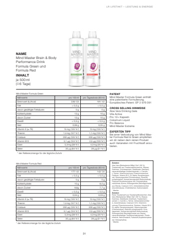 31GESUNDHEIT & ERN%u00c4HRUNGNAMEMind Master Brain & Body Performance Drink Formula Green und Formula RedINHALTje 500 ml(=%u02c6 6 Tage)N%u00e4hrwerte pro 100ml pro Tagesdosis (80ml)Brennwert (kJ/kcal) 226/ 53 181/ 42Fett < 0,5 g < 0,5 gdavon ges%u00e4ttigte Fetts%u00e4uren 0 g 0 gKohlenhydrate 13 g 10 gdavon Zucker 13 g 10 gEiwei%u00df < 0,5 g < 0,5 gSalz 0,06 g 0,05 gVitamin E (%u03b1-TE) 15mg (125 %*) 12mg (100 %*)Thiamin 1,4mg (127 %*) 1,1mg (100 %*)Fols%u00e4ure 250 %u00b5g (125 %*) 200 %u00b5g (100 %*)Vitamin B12 3,1 %u00b5g (124 %*) 2,5 %u00b5g (100 %*)Eisen 5,3mg (38 %*) 4,2mg (30 %*)Selen 35 %u00b5g (64 %*) 28 %u00b5g (51 %*)N%u00e4hrwerte pro 100ml pro Tagesdosis (80ml)Brennwert (kJ/kcal) 177/ 42 142/ 34Fett < 0,5 g < 0,5 gdavon ges%u00e4ttigte Fetts%u00e4uren 0 g 0 gKohlenhydrate 10 g 8,0 gdavon Zucker 9,6g 7,7 gEiwei%u00df < 0,5 g < 0,5 gSalz 0,04 g 0,03 gVitamin E (%u03b1-TE) 15mg (125 %*) 12mg (100 %*)Thiamin 1,4mg (127 %*) 1,1mg (100 %*)Fols%u00e4ure 250 %u00b5g (125 %*) 200 %u00b5g (100 %*)Vitamin B12 3,1 %u00b5g (124 %*) 2,5 %u00b5g (100 %*)Eisen 5,3mg (38 %*) 4,2mg (30 %*)Selen 35 %u00b5g (64 %*) 28 %u00b5g (51 %*)* der Referenzmenge f%u00fcr die t%u00e4gliche Zufuhr* der Referenzmenge f%u00fcr die t%u00e4gliche ZufuhrMind Master Formula GreenMind Master Formula Red Zutaten: Aloe Vera (Barbadensis Miller) Gel1 (36 %), Traubensaft aus Traubensaftkonzentrat, Wasser, Dextrose, Gr%u00fcnteeextrakt, Stabilisator (Xanthan), resveratrolhaltiger Kn%u00f6terichextrakt, L-CarnitinL-Tartrat, Vitaminmischung (Thiaminmononitrat, Fols%u00e4ure, Vitamin B12, DL-alpha-Tocopherylacetat), S%u00e4uerungsmittel (Citronens%u00e4ure), Eisen(III)-pyrophosphat, Konservierungsstoff (Kaliumsorbat), Farbstoff (Kupferkomplexe der Chlorophylline),nat%u00fcrliches Aroma, S%u00fc%u00dfungsmittel (Steviolglycoside aus Stevia), Coenzym Q10, Antioxidationsmittel (Ascorbins%u00e4ure), Cholinbitartrat, Natriumselenit.1 MexikoZutaten:Roter Traubensaft aus Traubensaftkonzentrat, Aloe Vera (Barbadensis Miller) Gel1 (36 %), Wasser, Dextrose, Stabilisator (Xanthan), Traubenkernextrakt, L-Carnitin-L-Tartrat, Antioxidationsmittel (L-Ascorbins%u00e4ure), Coenzym Q10, Vitaminmischung (Thiaminmononitrat, Fols%u00e4ure, Vitamin B12, DL-alpha-Tocopherylacetat), S%u00e4uerungsmittel(Citronens%u00e4ure), Eisen(III)-pyrophosphat, Gr%u00fcnteeextrakt, Konservierungsstoff (Kaliumsorbat), S%u00fc%u00dfungsmittel (Steviolglycoside aus Stevia), resveratrolhaltiger Traubenschalenextrakt, Cholinbitartrat, Natriumselenit, Farbstoff (Kupferkomplexe der Chlorophylline). 1 MexikoPATENTMind Master Formula Green enth%u00e4lt eine patentierte Formulierung. Europ%u00e4isches Patent: EP 2 976 091 CROSS SELLING HINWEISEAloe Vera Drinking GeleVita ActivePro 12+ KapselnColostrum LiquidPro BalanceMind Master ExtremeEXPERTEN TIPPBei einer Verkostung von Mind Master Formula Red & Green empfehlen wir dir neben dem reinen Produkt auch Varianeten mit Fruchtsaft anzubieten.LR LIFETAKT %u2013 LEISTUNG & ENERGIE