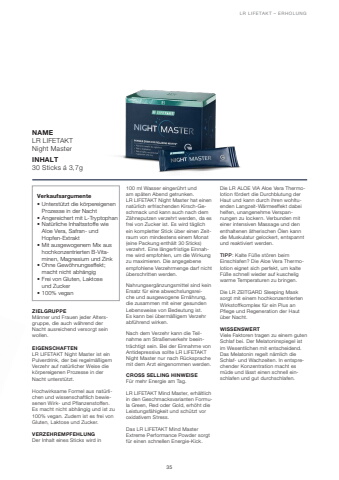 35GESUNDHEIT & ERN%u00c4HRUNGZIELGRUPPEM%u00e4nner und Frauen jeder Altersgruppe, die auch w%u00e4hrend der Nacht ausreichend versorgt sein wollen.EIGENSCHAFTENLR LIFETAKT Night Master ist ein Pulverdrink, der bei regelm%u00e4%u00dfigem Verzehr auf nat%u00fcrlicher Weise die k%u00f6rpereigenen Prozesse in der Nacht unterst%u00fctzt.Hochwirksame Formel aus nat%u00fcrlichen und wissenschaftlich bewiesenen Wirk- und Pflanzenstoffen. Es macht nicht abh%u00e4ngig und ist zu 100% vegan. Zudem ist es frei von Gluten, Laktose und Zucker.VERZEHREMPFEHLUNGDer Inhalt eines Sticks wird in 100 ml Wasser einger%u00fchrt und am sp%u00e4ten Abend getrunken. LR LIFETAKT Night Master hat einen nat%u00fcrlich erfrischenden Kirsch-Geschmack und kann auch nach dem Z%u00e4hneputzen verzehrt werden, da es frei von Zucker ist. Es wird t%u00e4glich ein kompletter Stick %u00fcber einen Zeitraum von mindestens einem Monat (eine Packung enth%u00e4lt 30 Sticks) verzehrt. Eine l%u00e4ngerfristige Einnahme wird empfohlen, um die Wirkung zu maximieren. Die angegebene empfohlene Verzehrmenge darf nicht %u00fcberschritten werden.Nahrungserg%u00e4nzungsmittel sind kein Ersatz f%u00fcr eine abwechslungsreiche und ausgewogene Ern%u00e4hrung, die zusammen mit einer gesunden Lebensweise von Bedeutung ist. Es kann bei %u00fcberm%u00e4%u00dfigem Verzehr abf%u00fchrend wirken.Nach dem Verzehr kann die Teilnahme am Stra%u00dfenverkehr beeintr%u00e4chtigt sein. Bei der Einnahme von Antidepressiva sollte LR LIFETAKT Night Master nur nach R%u00fccksprache mit dem Arzt eingenommen werden.CROSS SELLING HINWEISEF%u00fcr mehr Energie am Tag. LR LIFETAKT Mind Master, erh%u00e4ltlich in den Geschmacksvarianten Formula Green, Red oder Gold, erh%u00f6ht die Leistungsf%u00e4higkeit und sch%u00fctzt vor oxidativem Stress. Das LR LIFETAKT Mind Master Extreme Performance Powder sorgt f%u00fcr einen schnellen Energie-Kick.Die LR ALOE VIA Aloe Vera Thermolotion f%u00f6rdert die Durchblutung der Haut und kann durch ihren wohltuenden Langzeit-W%u00e4rmeeffekt dabei helfen, unangenehme Verspannungen zu lockern. Verbunden mit einer intensiven Massage und den enthaltenen %u00e4therischen %u00d6len kann die Muskulatur gelockert, entspannt und reaktiviert werden. TIPP: Kalte F%u00fc%u00dfe st%u00f6ren beim Einschlafen? Die Aloe Vera Thermolotion eignet sich perfekt, um kalte F%u00fc%u00dfe schnell wieder auf kuschelig warme Temperaturen zu bringen. Die LR ZEITGARD Sleeping Mask sorgt mit einem hochkonzentrierten Wirkstoffkomplex f%u00fcr ein Plus an Pflege und Regeneration der Haut %u00fcber Nacht.WISSENSWERTViele Faktoren tragen zu einem guten Schlaf bei. Der Melatoninspiegel ist im Wesentlichen mit entscheidend. Das Melatonin regelt n%u00e4mlich die Schlaf- und Wachzeiten. In entsprechender Konzentration macht es m%u00fcde und l%u00e4sst einen schnell einschlafen und gut durchschlafen.NAMELR LIFETAKTNight MasterINHALT30 Sticks %u00e1 3,7g Verkaufsargumente%u2022 Unterst%u00fctzt die k%u00f6rpereigenen Prozesse in der Nacht%u2022 Angereichert mit L-Tryptophan%u2022 Nat%u00fcrliche Inhaltsstoffe wieAloe Vera, Safran- und Hopfen-Extrakt%u2022 Mit ausgewogenem Mix aus hochkonzentrierten B-Vitaminen, Magnesium und Zink%u2022 Ohne Gew%u00f6hnungseffekt; macht nicht abh%u00e4ngig%u2022 Frei von Gluten, Laktose und Zucker%u2022 100% vegan LR LIFETAKT %u2013 ERHOLUNG