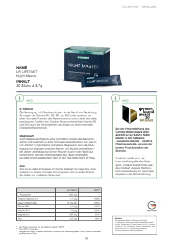 36GESUNDHEIT & ERN%u00c4HRUNG LR LIFETAKT %u2013 ERHOLUNG NAMELR LIFETAKTNight MasterINHALT30 Sticks %u00e1 3,7g * der Referenzmenge f%u00fcr die t%u00e4gliche Zufuhr (NRV)** Kein NRV vorhanden 1 Magnesium tr%u00e4gt zu einer normalen Funktion des Nervensystems und zu einer normalen Muskelfunktion bei.pro St%u00fcck NRV*L-Tryptophan 250 mg **Thiamin (Vitamin B1) 1,1 mg 100%Niacin (Vitamin B3) 16 mg NE 100%Vitamin B6 1,4 mg 100%Vitamin B12 2,5 %u00b5g 100%Magnesium 250 mg 67%Zink 6,5 mg 65%Bei der Preisverleihung des German Brand Award 2020 gewinnt LR LIFETAKT Night Master in der Kategorie %u00bbExcellents Brands %u2013 Health & Pharmaceuticals%u00ab als eine der besten Produktmarken der Branche. Zus%u00e4tzlich erh%u00e4lt es in der branchen%u00fcbergreifenden Kategorie %u00bbProduct brand of the year%u00ab das Pr%u00e4dikat %u00bbSpecial Mention%u00ab: Eine Auszeichnung f%u00fcr besondere Aspekte in der Markenf%u00fchrung. B-Vitamine Die Versorgung mit Vitaminen ist auch in der Nacht von Bedeutung: So tragen die Vitamine B1, B3, B6 und B12 unter anderem zu einer normalen Funktion des Nervensystems und zu einer normalen psychischen Funktion bei. Dar%u00fcber hinaus unterst%u00fctzen Vitamin B6 und B12 auch die Immunabwehr und tragen zu einem normalen Energiestoffwechsel bei.Magnesium Auch Magnesium tr%u00e4gt zu einer normalen Funktion des Nervensystems und zus%u00e4tzlich zu einer normalen Muskelfunktion bei: Das im LR LIFETAKT Night Master enthaltene Magnesium kann die %u00dcbertragung von Signalen zwischen Nerven und Muskel unterst%u00fctzen.1Mit dieser Unterst%u00fctzung k%u00f6nnen Muskeln auch in der Nacht gut funktionieren und die Anstrengungen des Tages verarbeiten. So steht einem ausgeruhten Start in den Tag nichts mehr im Weg.Zink Zink ist an vielen Prozessen im K%u00f6rper beteiligt: So tr%u00e4gt Zink unter anderem zu einem normalen Immunsystem und zu einem Schutz der Zellen vor oxidativen Stress bei.i iMADE IN GERMANYZutaten:Trimagnesiumdicitrat, S%u00fc%u00dfungsmittel (Xylit), L-Tryptophan, f%u00e4rbendes Lebensmittel (Rote Beete Pulver), Zinkgluconat, Safran Extrakt (0,8 %), Hopfen Extrakt (0,7 %), nat%u00fcrliches Aroma, Nicotinamid, Aloe Vera Pulver (0,4 %), Pyridoxinhydrochlorid,Thiaminmononitrat, Methylcobalamin. INFO INFO
