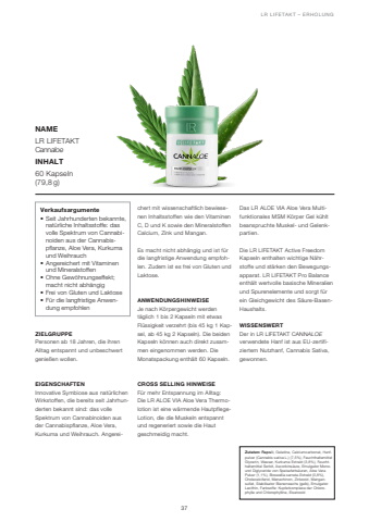 37GESUNDHEIT & ERN%u00c4HRUNGNAMELR LIFETAKTCannaloeINHALT60 Kapseln(79,8 g)Zutaten: Raps%u00f6l, Gelatine, Calciumcarbonat, Hanfpulver (Cannabis sativa L.) (7,5%), Feuchthaltemittel Glycerin, Wasser, Kurkuma Extrakt (3,8%), Feuchthaltemittel Sorbit, Ascorbins%u00e4ure, Emulgator Monound Diglyceride von Speisefetts%u00e4uren, Aloe Vera Pulver (1,1%), Boswellia serrata-Extrakt (0,8%), Cholecalciferol, Menachinon, Zinkoxid, Mangansulfat, Stabilisator Bienenwachs (gelb), Emulgator Lecithin, Farbsoffe: Kupferkomplexe der Chlorophylle und Chlorophylline, EisenoxidVerkaufsargumente%u2022 Seit Jahrhunderten bekannte, nat%u00fcrliche Inhaltsstoffe: das volle Spektrum von Cannabinoiden aus der Cannabispflanze, Aloe Vera, Kurkuma und Weihrauch%u2022 Angereichert mit Vitaminen und Mineralstoffen%u2022 Ohne Gew%u00f6hnungseffekt; macht nicht abh%u00e4ngig%u2022 Frei von Gluten und Laktose %u2022 F%u00fcr die langfristige Anwendung empfohlenLR LIFETAKT %u2013 ERHOLUNG ZIELGRUPPEPersonen ab 18 Jahren, die ihren Alltag entspannt und unbeschwert genie%u00dfen wollen.EIGENSCHAFTENInnovative Symbiose aus nat%u00fcrlichen Wirkstoffen, die bereits seit Jahrhunderten bekannt sind: das volleSpektrum von Cannabinoiden aus der Cannabispflanze, Aloe Vera, Kurkuma und Weihrauch. Angereichert mit wissenschaftlich bewiesenen Inhaltsstoffen wie den Vitaminen C, D und K sowie den Mineralstoffen Calcium, Zink und Mangan.Es macht nicht abh%u00e4ngig und ist f%u00fcr die langfristige Anwendung empfohlen. Zudem ist es frei von Gluten und Laktose.ANWENDUNGSHINWEISEJe nach K%u00f6rpergewicht werden t%u00e4glich 1 bis 2 Kapseln mit etwas Fl%u00fcssigkeit verzehrt (bis 45 kg 1 Kapsel, ab 45 kg 2 Kapseln). Die beiden Kapseln k%u00f6nnen auch direkt zusammen eingenommen werden. Die Monatspackung enth%u00e4lt 60 Kapseln. CROSS SELLING HINWEISEF%u00fcr mehr Entspannung im Alltag:Die LR ALOE VIA Aloe Vera Thermolotion ist eine w%u00e4rmende HautpflegeLotion, die die Muskeln entspannt und regeneriert sowie die Haut geschmeidig macht.Das LR ALOE VIA Aloe Vera Multifunktionales MSM K%u00f6rper Gel k%u00fchlt beanspruchte Muskel- und Gelenkpartien.Die LR LIFETAKT Active Freedom Kapseln enthalten wichtige N%u00e4hrstoffe und st%u00e4rken den Bewegungsapparat. LR LIFETAKT Pro Balance enth%u00e4lt wertvolle basische Mineralien und Spurenelemente und sorgt f%u00fcr ein Gleichgewicht des S%u00e4ure-BasenHaushalts.WISSENSWERTDer in LR LIFETAKT CANNALOEverwendete Hanf ist aus EU-zertifiziertem Nutzhanf, Cannabis Sativa, gewonnen.