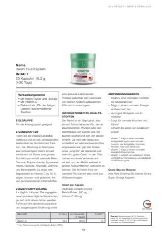 40GESUNDHEIT & ERN%u00c4HRUNGMADE IN GERMANYNameReishi Plus KapselnINHALT30 Kapseln/ 15,2 g(=%u02c6 30 Tage)Verkaufsargumente%u2022 Mit Reishi-Pulver und -Extrakt %u2022 Mit Vitamin C %u2022 Bekannt als %u201ePilz des langen Lebens%u201c aus fern%u00f6stlicher Tradition** der Referenzmenge f%u00fcr die t%u00e4gliche Zufuhr (NRV)N%u00e4hrstoffe in 100 g pro Tagesration(1 Kapsel) % NRV**Vitamin C 12 g 60mg 75Zutaten: Reishipilzextrakt (48 %), Reishipilzpulver (20 %), Kapselh%u00fclle (Hydroxypropylmethylcellulose), Vitamin C (12 %), Trennmittel (Magnesiumsalze von Speisefetts%u00e4uren)LR LIFETAKT %u2013 HERZ & KREISLAUFZIELGRUPPEF%u00fcr alle Altersgruppen geeignetEIGENSCHAFTENReishi gilt als Vitalpilz/Langlebigkeitskraut und ist seit Jahrtausenden Bestandteil der fern%u00f6stlichen Tradition. Die Mischung in Reishi plus aus hochwertigem Reishi-Extrakt kombiniert mit Pulver vom ganzen Fruchtk%u00f6rper enth%u00e4lt wertvolle BetaGlucane, Polysaccheride, Spurenelemente, Steroide, Alkaloide, Vitamine und Mineralstoffe. Es deckt den Tagesbedarf an Vitamin C zu 75 %. Vegan, lactose- und glutenfrei, frei von genmanipulierten Inhaltsstoffen. VERZEHREMPFEHLUNG1 x t%u00e4glich 1 Kapsel. Die angegebene empfohlene t%u00e4gliche Verzehrmenge darf nicht %u00fcberschritten werden. Achte auf eine abwechslungsreiche und ausgewogene Ern%u00e4hrung sowie eine gesunde Lebensweise. Produkt au%u00dferhalb der Reichweite von kleinen Kindern aufbewahren. K%u00fchl und trocken lagern.INFORMATIONEN ZU INHALTSSTOFFENDer Reishi ist ein Saprophyt, also ein auf Totholz lebender Pilz, der an Baumst%u00fcmpfen, Wurzeln oder der Stammbasis von Eichen und Rotbuchen w%u00e4chst und sich von diesen ern%u00e4hrt. Da man sehr lange ausschlie%u00dflich auf wild wachsende Pilze angewiesen war, galt das Finden eines %u201eLing Zhi%u201c als Gl%u00fccksfall undsteht f%u00fcr gutes Omen. In den 70erJahren wurde ein Verfahren entwickelt, um den Reishi weltweit ingro%u00dfen Aufzuchtfarmen kultivieren zuk%u00f6nnen. Der im Reishi Plus verwendete Pilz stammt also nicht ausWildsammlungen. Inhalt pro Kapsel:Reishipilz-Extrakt: 240 mg Reishi-Pulver: 100 mg Vitamin C: 60 mgANWENDUNGSGEBIETE%u2013 Tr%u00e4gt zu einer normalen Funktion der Blutgef%u00e4%u00dfe bei1%u2013 Tr%u00e4gt zu einem normalen Energiestoffwechsel2 bei%u2013 Verringert M%u00fcdigkeit und Erm%u00fcdung3%u2013 Sorgt f%u00fcr normale Knochen und Z%u00e4hne1%u2013 Sch%u00fctzt die Zellen vor oxidativemStress31 Vitamin C tr%u00e4gt zu einer normalen Kollagenbildung f%u00fcr eine normale Funktion der Blutgef%u00e4%u00dfe, Knochen, Knorpel, Haut und Z%u00e4hne bei. 2 Vitamin C tr%u00e4gt zu einem normalen Energiestoffwechsel bei. 3 Vitamin C sch%u00fctzt vor oxidativem Stress und tr%u00e4gt zur Verringerung von M%u00fcdigkeit und Erm%u00fcdung bei.Cross Selling HinweiseAloe Vera Drinking Gel Intense SiveraSuper Omega Kapseln