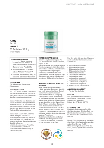43GESUNDHEIT & ERN%u00c4HRUNGNAMEPro 12INHALT30 Tabletten/ 17,9 g(=%u02c6 30 Tage)LR LIFETAKT %u2013 DARM & VERDAUUNGZIELGRUPPEF%u00fcr M%u00e4nner und Frauen jeder Altersklasse.EIGENSCHAFTENPRO 12+ ist die n%u00e4chste Generation von Bakterienpr%u00e4paraten, die mit einem TRIPLEBIOTIC 3-fach Komplex den Darm positiv unterst%u00fctzen.Neben Pr%u00e4biotika und Bakterien enthalten Postbiotika den patentierten Wirkstoff Prolac-T%u2122. Er unterst%u00fctzt die Entgiftungsprozesse und gilt als die n%u00e4chste %u201eEvolutionsstufe%u201c in der Welt der Milchs%u00e4urebakterien.Neben dem neuen TRIPLEBIOTIC 3-fach-Komplex hat Pro 12+eine Doppelverkapselung, die die 1 Mrd. Bakterien pro Kapsel aus 12 unterschiedlichen Bakterienst%u00e4mmen deutlich effizientersch%u00fctzt als viele andere Produkte, sodass Pr%u00e4biotika, Bakterienund Postbiotika unbesch%u00e4digt im Darm ankommen.VERZEHREMPFEHLUNGNimm 1 x t%u00e4glich eine Kapsel Pro 12+ zusammen mit einem Glas Fl%u00fcssigkeit zu dir. Die angegebene empfohlene t%u00e4gliche Verzehrmenge darf nicht %u00fcberschritten werden. Achte auf eine abwechslungsreiche und ausgewogeneErn%u00e4hrung sowie eine gesunde Lebensweise. Produkt au%u00dferhalb der Reichweite von kleinen Kindern aufbewahren. K%u00fchl und trocken lagern.INFORMATIONEN ZU INHALTSSTOFFENJede Kapsel enth%u00e4lt insgesamt 1 Mrd. wertvoller Bakterien, die sich aus zw%u00f6lf unterschiedlichen Bakterienst%u00e4mmen zusammensetzen. Diese Kombination ist einzigartig. Entscheidend f%u00fcr die Wirksamkeit ist die %u00dcberlebensrate der Bakterien w%u00e4hrend der kritischen Magenpassage auf dem Weg in den Darm. Denn die im Magen befindliche Salzs%u00e4ure kann die Bakterien zerst%u00f6ren und sie so unwirksam machen. Pro 12+ besitzt eine doppelte doppelte Verkapselung, die die Bakterien deutlich effizienter sch%u00fctzt als im Vergleich zu anderen Produkten.Zus%u00e4tzlich enthalten ist der Ballaststoff FOS (Fructooligosaccharide). Er wirkt als zus%u00e4tzliche %u201eStarthilfe%u201c f%u00fcr die Bakterien im K%u00f6rper.Pro 12+ setzt sich aus den folgenden zw%u00f6lf wertvollen Bakterienkulturen zusammen: %u2022 Bifidobacterium Iongum%u2022 Bifidobacterium breve%u2022 Bifidobacterium bifidum%u2022 Bifidobacterium infantis%u2022 Bifidobacterium lactis%u2022 Lactobacillus plantarum%u2022 Lactobacillus casei%u2022 Lactobacillus paracasei%u2022 Lactobacillus rhamnosus%u2022 Lactobacillus acidophilus%u2022 Lactobacillus bulgaricus%u2022 Streptococcus thermophilusANWENDUNGSGEBIET%u2013 F%u00fcr das WohlbefindenPATENTDas gesamte Produkt wurde aufgrund seiner besonderen Zusammensetzung patentiert. Patent-Nr.: EP 2 228 067 A1EXPERTEN TIPPDie ideale Erg%u00e4nzung zu Pro 12+ sind die Aloe Vera Drinking Gele von LR. Sie bereiten den Darm optimal f%u00fcr die in Pro 12+ enthaltenen Bakterien vor! F%u00fcr die Durchf%u00fchrung einer umf%u00e4nglichen Darm- Stoffwechselkur werdenneben Pro 12+ und ALOEVERA Drinking Gele auch PRO Balance, Liver Support und Colostrum ben%u00f6tigt.Verkaufsargumente%u2022 Innovativer TRIPLEBIOTIC 3-fach Komplex mit Pr%u00e4biotika, Bakterien und Postbiotika%u2022 Mit patentiertem, postbiotischen Wirkstoff Prolac-T%u2122%u2022 Doppelte Verkapselung sorgt f%u00fcr besseren Schutz der Bakterien.