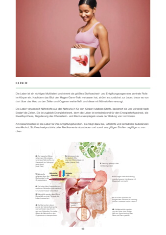 48LEBER4. Die Darmzotten dienen prim%u00e4r der N%u00e4hstoffaufnahme und verhindern das Eindringen von Giftstoffen. Sie helfen dabei, die N%u00e4hrstoffe in den Organismus zu transportieren. 5. N%u00e4hrstoffe werden %u00fcber kleine Blutgef%u00e4%u00dfe und die Pfortader zur Leber transportiert.6. Die Leber filtert N%u00e4hrstoffe von restlichen Giftstoffen und macht sie f%u00fcr unseren K%u00f6rper verwertbar. 7. N%u00e4hrstoffe gelangen %u00fcber den Blutkreislauf in die Grundsubstanz. 8. Der basische Zellzwischenraum (Grundsubstanz) l%u00e4sst N%u00e4hrstoffe und Sauerstoff zur Zellversorgung durch.(roter Pfeil)N%u00e4hrstoffe + SauerstoffSchlacke + CO2BLUTKREISLAUF9. Abtransport der Schlacke & CO2%u00fcber den Blutkreislauf zur Leber. (blauer Pfeil) 1. Nahrung gelangt in den Verdauungskanal.2. Im Magen wird die Nahrung zwecks besserer Verdauung mit Magensaft vermischt.3. Die durch Speichel und Magens%u00e4fte vorverdaute Nahrung wird im D%u00fcnndarm weiter verdaut. 10. Abfallprodukte werden von der Leber %u00fcber Blutgef%u00e4%u00dfe zur Ausscheidung %u00fcber Niere und Darm geleitet.MAGENFeine Blutgef%u00e4%u00dfe PFORTADERDie Leber ist ein richtiges Multitalent und nimmt als gr%u00f6%u00dftes Stoffwechsel- und Entgiftungsorgan eine zentrale Rolle im K%u00f6rper ein. Nachdem das Blut den Magen-Darm-Trakt verlassen hat, str%u00f6mt es zun%u00e4chst zur Leber, bevor es von dort %u00fcber das Herz zu den Zellen und Organen weiterflie%u00dft und diese mit N%u00e4hrstoffen versorgt.Die Leber verwandelt N%u00e4hrstoffe aus der Nahrung in f%u00fcr den K%u00f6rper nutzbare Stoffe, speichert sie und versorgt nach Bedarf die Zellen. Sie ist zugleich Energielieferant, denn die Leber ist entscheidend f%u00fcr den Energiestoffwechsel, die Eiwei%u00dfsynthese, Regulierung des Cholesterin- und Blutzuckerspiegels sowie der Bildung von Hormonen.Am bekanntesten ist die Leber f%u00fcr ihre Entgiftungsfunktion. Sie tr%u00e4gt dazu bei, Giftstoffe und sch%u00e4dliche Substanzen wie Alkohol, Stoffwechselprodukte oder Medikamente abzubauen und somit aus giftigen Stoffen ungiftige zu machen.