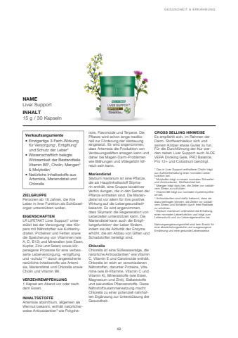 49GESUNDHEIT & ERN%u00c4HRUNGNAMELiver SupportINHALT15 g / 30 KapselnVerkaufsargumente%u2022 Einzigartige 3-Fach-Wirkung f%u00fcr Versorgung1, Entgiftung* und Schutz der Leber2%u2022 Wissenschaftlich belegte Wirksamkeit der Bestandteile Vitamin B63, Cholin, Mangan2& Molybd%u00e4n1%u2022 Nat%u00fcrliche Inhaltsstoffe aus Artemisia, Mariendistel und ChlorellaZIELGRUPPEPersonen ab 18 Jahren, die ihre Leber in ihrer Funktion als Schl%u00fcsselorgan unterst%u00fctzen wollen.EIGENSCHAFTENLR LIFETAKT Liver Support* unterst%u00fctzt bei der Versorgung1 des K%u00f6rpers mit N%u00e4hrstoffen wie Kohlenhydraten, Proteinen und Fetten sowie die Speicherung von Vitaminen (wie A, D, B12) und Mineralien (wie Eisen, Kupfer, Zink und Selen) sowie k%u00f6rpereigene Prozesse f%u00fcr eine verbesserte Leberversorgung, -entgiftung und -schutz*1,2 durch angereicherte nat%u00fcrliche Inhaltsstoffe wie Artemisia, Mariendistel und Chlorella sowie Cholin und Vitamin B6. VERZEHREMPFEHLUNG1 Kapsel am Abend vor oder nach dem Essen. INHALTSSTOFFEArtemisia absinthium, allgemein als Wermut bekannt, enth%u00e4lt nat%u00fcrlicherweise Antioxidantien4 wie Polyphenole, Flavonoide und Terpene. Die Pflanze wird schon lange traditionell zur F%u00f6rderung der Verdauung eingesetzt. Es wird angenommen, dass Artemisia die Produktion von Verdauungss%u00e4ften anregen kann und daher bei Magen-Darm-Problemen wie Bl%u00e4hungen und V%u00f6llegef%u00fchl hilfreich sein kann.MariendistelSilybum marianum ist eine Pflanze, die als Hauptinhaltsstoff Silymarin enth%u00e4lt, eine Gruppe bioaktiver Verbin dungen, die in den Samen der Pflanze enthalten sind. Die Mariendistel ist vor allem f%u00fcr ihre positive Wirkung auf die Lebergesundheit5bekannt. Es wird angenommen, dass Silymarin die Regeneration von Leberzellen unterst%u00fctzen kann. Die Mariendistel kann auch die Entgiftungsfunktion5 der Leber f%u00f6rdern, indem sie die Aktivit%u00e4t der Enzyme erh%u00f6ht, die am Abbau von Giften und Schadstoffen beteiligt sind.ChlorellaChlorella ist eine S%u00fc%u00dfwasseralge, die nat%u00fcrliche Antioxidantien1 wie Vitamin C, Vitamin E und Carotinoide enth%u00e4lt. Chlorella ist reich an verschiedenen N%u00e4hrstoffen, darunter Proteine, Vitamine (wie B-Vitamine, Vitamin C und Vitamin K), Mineralstoffe (wie Eisen, Magnesium und Zink), Ballaststoffe und sekund%u00e4re Pflanzenstoffe. Diese N%u00e4hrstoffzusammensetzung macht Chlorella zu einer potenziell nahrhaften Erg%u00e4nzung zur Unterst%u00fctzung der Gesundheit.CROSS SELLING HINWEISEEs empfiehlt sich, im Rahmen der Darm- Stoffwechselkur sich und seinem K%u00f6rper etwas Gutes zu tun. F%u00fcr die Durchf%u00fchrung der Kur werden neben Liver Support auch ALOE VERA Drinking Gele, PRO Balance, Pro 12+ und Colostrum ben%u00f6tigt.* Das in Liver Support enthaltene Cholin tr%u00e4gt zur Aufrechterhaltung einer normalen Leberfunktion bei. 1 Molybd%u00e4n tr%u00e4gt zu einem normalen Schwefelund Aminos%u00e4uren- Stoffwechsel bei. 2 Mangan tr%u00e4gt dazu bei, die Zellen vor oxidativem Stress zu sch%u00fctzen.3 Vitamin B6 tr%u00e4gt zur normalen Cysteinsynthese bei.4 Antioxidantien sind daf%u00fcr bekannt, dass sie dazu beitragen k%u00f6nnen, die Zellen vor oxidativem Stress und Sch%u00e4den durch freie Radikale zu sch%u00fctzen.5 Silybum marianum unterst%u00fctzt die Erhaltung einer normalen Leberfunktion und tr%u00e4gt zum Leberschutz und zur Leberregeneration bei.Nahrungserg%u00e4nzungsmittel sind kein Ersatz f%u00fcr eine abwechslungsreiche und ausgewogene Ern%u00e4hrung und eine gesunde Lebensweise