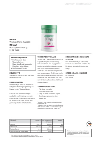 51GESUNDHEIT & ERN%u00c4HRUNGMADE IN GERMANYLR LIFETAKT %u2013 HORMONHAUSHALTNAMEWoman Phyto KapselnINHALT90 Kapseln/ 46,8 g(=%u02c6 30 Tage)Zutaten: Calciumcarbonat, Kapselh%u00fclle (Hydroxypropylmethylcellulose), Rotklee-Extrakt (16 %), Trennmittel (Magnesiumsalze von Speisefetts%u00e4uren), Vitamin DN%u00e4hrstoffe in 100 g pro Tagesration (3 Kapsel)% NRV*Calcium 25,6 g 400mg 50Vitamin D3 321 %u00b5g 5,0 %u00b5g 100Rotklee-Extrakt 16 g 250mg **davon Isoflavone aus Rotklee 3,2 g 50mg **ZIELGRUPPESpeziell f%u00fcr Frauen in den Wechseljahren entwickelt. EIGENSCHAFTENWoman Phyto activ ist die sinnvolle t%u00e4gliche Nahrungserg%u00e4nzung f%u00fcr Frauen in den Wechseljahren. Calcium und Vitamin D tragen zus%u00e4tzlich zur Erhaltung normaler Knochen bei %u2013 gerade im Alter wichtig. Frei von Lactose, Gluten und genmanipulierten Inhaltsstoffen.VERZEHREMPFEHLUNGT%u00e4glich 3 x 1 Kapsel (rein pflanzliche Kapselh%u00fcllen) mit etwas Fl%u00fcssigkeit einnehmen. Die angegebene empfohlene t%u00e4gliche Verzehrmenge darf nicht %u00fcberschritten werden. Achte auf eine abwechslungsreiche und ausgewogene Ern%u00e4hrung sowie eine gesunde Lebensweise. Produkt au%u00dferhalb der Reichweite von kleinen Kindern aufbewahren. K%u00fchl und trocken lagern.ANWENDUNGSGEBIET%u2013 F%u00fcr einen normalen Energiestoffwechsel1%u2013 Tr%u00e4gt zu einer normalen Signal%u00fcbertragung zwischen den Zellen bei21 Vitamin C tr%u00e4gt zu einem normalen Energiestoffwechsel bei.2 Calcium tr%u00e4gt zu einem normalen Energiestoffwechsel und zu einer normalen Signal%u00fcbertragung zwischen den Zellen bei.INFORMATIONEN ZU INHALTSSTOFFENDas in Woman Phyto enthaltene Calcium und Vitamin D wird f%u00fcr die Erhaltung normaler Knochen ben%u00f6tigt.CROSS SELLING HINWEISEPro BalanceVita ActiveVerkaufsargumente%u2022 F%u00fcr Frauen in den Wechseljahren%u2022 Kann den Erhalt gesunder Knochen unterst%u00fctzen%u2022 Mit Rotklee-Extrakt* der Referenzmenge f%u00fcr die t%u00e4gliche Zufuhr (NRV)** bisher keine Referenzmenge f%u00fcr die t%u00e4gliche Zufuhr (NRV)