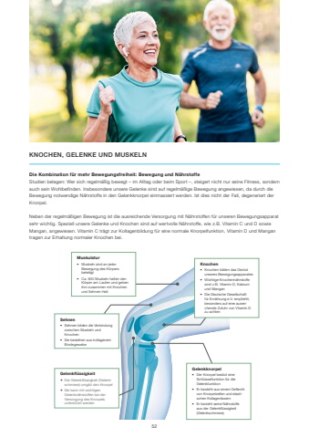 52Muskulatur%u2022 Muskeln sind an jeder Bewegung des K%u00f6rpers beteiligt %u2022 Ca. 600 Muskeln halten den K%u00f6rper am Laufen und geben ihm zusammen mit Knochen und Sehnen HaltSehnen%u2022 Sehnen bilden die Verbindung zwischen Muskeln und Knochen%u2022 Sie bestehen aus kollagenem BindegewebeDie Kombination f%u00fcr mehr Bewegungsfreiheit: Bewegung und N%u00e4hrstoffeStudien belegen: Wer sich regelm%u00e4%u00dfig bewegt %u2013 im Alltag oder beim Sport %u2013, steigert nicht nur seine Fitness, sondern auch sein Wohlbefinden. Insbesondere unsere Gelenke sind auf regelm%u00e4%u00dfige Bewegung angewiesen, da durch die Bewegung notwendige N%u00e4hrstoffe in den Gelenkknorpel einmassiert werden. Ist dies nicht der Fall, degeneriert der Knorpel.Neben der regelm%u00e4%u00dfigen Bewegung ist die ausreichende Versorgung mit N%u00e4hrstoffen f%u00fcr unseren Bewegungsapparat sehr wichtig. Speziell unsere Gelenke und Knochen sind auf wertvolle N%u00e4hrstoffe, wie z.B. Vitamin C und D sowie Mangan, angewiesen. Vitamin C tr%u00e4gt zur Kollagenbildung f%u00fcr eine normale Knorpelfunktion, Vitamin D und Mangan tragen zur Erhaltung normaler Knochen bei.Knochen%u2022 Knochen bilden das Ger%u00fcst unseres Bewegungsapparates%u2022 Wichtige Knochenn%u00e4hrstoffe sind z.B. Vitamin D, Kalzium und Mangan%u2022 Die Deutsche Gesellschaft f%u00fcr Ern%u00e4hrung e.V. empfiehlt, besonders auf eine ausreichende Zufuhr von Vitamin D zu achtenGelenkknorpel%u2022 Der Knorpel besitzt eine Schl%u00fcsselfunktion f%u00fcr die Gelenkfunktion%u2022 Er besteht aus einem Geflecht von Knorpelzellen und elastischen Kollagenfasern%u2022 Er bezieht seine N%u00e4hrstoffe aus der Gelenkfl%u00fcssigkeit (Gelenkschmiere)Gelenkfl%u00fcssigkeit%uf0ae Die Gelenkfl%u00fcssigkeit (Gelenkschmiere) umgibt den Knorpel%uf0ae Sie kann mit wichtigen Gelenkn%u00e4hrstoffen bei der Versorgung des Knorpels unterst%u00fctzt werden KNOCHEN, GELENKE UND MUSKELN
