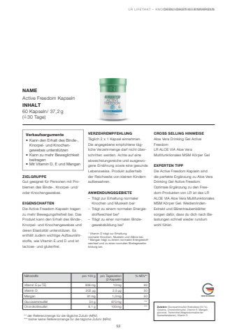 53GESUNDHEIT & ERN%u00c4HRUNGMADE IN GERMANYNAMEActive Freedom KapselnINHALT60 Kapseln/ 37,2 g (=%u02c6 30 Tage)Zutaten: Glucosaminsulfat (Krebstiere) (54 %), Gelatine, Chondroitinsulfat, Vitamin E, Mangangluconat, Trennmittel (Magnesiumsalze der Speisefetts%u00e4uren), Vitamin DZIELGRUPPEGut geeignet f%u00fcr Personen mit Problemen des Binde-, Knorpel- und/oder Knochengewebes.EIGENSCHAFTENDie Active Freedom Kapseln tragen zu mehr Bewegungsfreiheit bei. Das Produkt kann den Erhalt des Binde-, Knorpel- und Knochengewebes und deren Elastizit%u00e4t unterst%u00fctzen. Es enth%u00e4lt zudem wichtige Aufbaun%u00e4hrstoffe, wie Vitamin E und D und ist lactose- und glutenfrei. VERZEHREMPFEHLUNGT%u00e4glich 2 x 1 Kapsel einnehmen. Die angegebene empfohlene t%u00e4gliche Verzehrmenge darf nicht %u00fcberschritten werden. Achte auf eine abwechslungsreiche und ausgewogene Ern%u00e4hrung sowie eine gesunde Lebensweise. Produkt au%u00dferhalb der Reichweite von kleinen Kindern aufbewahren.ANWENDUNGSGEBIETE%u2013 Tr%u00e4gt zur Erhaltung normaler Knochen und Muskeln bei1%u2013 Tr%u00e4gt zu einem normalen Energiestoffwechsel bei2%u2013 Tr%u00e4gt zu einer normalen Bindegewebsbildung bei21 Vitamin D tr%u00e4gt zur Erhaltung normaler Knochen, Muskeln und Z%u00e4hne bei.2 Mangan tr%u00e4gt zu einem normalen Energiestoffwechsel und zu einer normalen Bindegewebsbildung bei.CROSS SELLING HINWEISEAloe Vera Drinking Gel Active FreedomLR ALOE VIA Aloe Vera Multifunktionales MSM K%u00f6rper GelEXPERTEN TIPPDie Active Freedom Kapseln sind die perfekte Erg%u00e4nzung zu Aloe Vera Drinking Gel Active Freedom.Optimale Erg%u00e4nzung zu den Freedom-Produkten von LR ist das LR ALOE VIA Aloe Vera Multifunktionales MSM K%u00f6rper Gel. WeidenrindenExtrakt und B%u00e4rentraubenbl%u00e4tter sorgen daf%u00fcr, dass du dich nach Belastungen schnell wieder rundum wohl f%u00fchlst.Verkaufsargumente%u2022 Kann den Erhalt des Binde-, Knorpel- und Knochengewebes unterst%u00fctzen%u2022 Kann zu mehr Beweglichkeit beitragen%u2022 Mit Vitamin D, E und Mangan N%u00e4hrstoffe pro 100 g pro Tagesration (2 Kapseln)% NRV**Vitamin E (%u03b1-TE) 806mg 10mg 83Vitamin D 202 %u00b5g 2,5 %u00b5g 50Mangan 81mg 1,0mg 50Glucosaminsulfat 54 g 675mg ***Chondroitinsulfat 8,1 g 100mg ***** der Referenzmenge f%u00fcr die t%u00e4gliche Zufuhr (NRV)*** bisher keine Referenzmenge f%u00fcr die t%u00e4gliche Zufuhr (NRV)LR LIFETAKT %u2013 KNOCHEN, GELENKE & MUSKELN