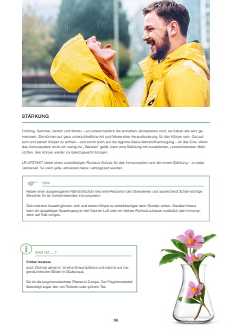 56Fr%u00fchling, Sommer, Herbst und Winter %u2013 so unterschiedlich die einzelnen Jahreszeiten sind, sie haben alle eins gemeinsam: Sie k%u00f6nnen auf ganz unterschiedliche Art und Weise eine Herausforderung f%u00fcr den K%u00f6rper sein. Gut auf sich und seinen K%u00f6rper zu achten %u2013 und somit auch auf die t%u00e4gliche Basis-N%u00e4hrstoffversorgung %u2013 ist das Eine. Wenn das Immunsystem doch ein wenig ins %u201eWanken\en N%u00e4hrstoffen, den K%u00f6rper wieder ins Gleichgewicht bringen.LR LIFETAKT bietet einen zuverl%u00e4ssigen Rundum-Schutz f%u00fcr das Immunsystem und die innere St%u00e4rkung %u2013 zu jeder Jahreszeit. So kann jede Jahreszeit deine Lieblingszeit werden.ST%u00c4RKUNGCistus Incanusauch Zistrose genannt, ist eine Strauchpflanze und w%u00e4chst auf magensiumreichen B%u00f6den in S%u00fcdeuropa. Sie ist die polyphenolreichste Pflanze in Europa. Der Polyphenolanteil %u00fcbersteigt sogar den von Rotwein oder gr%u00fcnem Tee.i WAS IST ... ?Neben einer ausgewogenen N%u00e4hrstoffzufuhr sind eine Reduktion des Stresslevels und ausreichend Schlaf wichtige Elemente f%u00fcr ein funktionierendes Immunsystem. Sich mal eine Auszeit g%u00f6nnen, sich und seinen K%u00f6rper zu entschleunigen kann Wunder wirken. Dar%u00fcber hinaus kann ein ausgiebiger Spaziergang an der frischen Luft oder ein kleines Workout zuhause zus%u00e4tzlich das Immunsystem auf Trab bringen.%uf044TIPP56