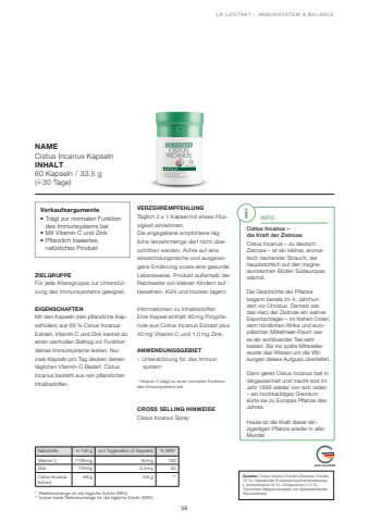 58GESUNDHEIT & ERN%u00c4HRUNGMADE IN GERMANYNAMECistus Incanus KapselnINHALT60 Kapseln / 33,5 g(=%u02c6 30 Tage)Verkaufsargumente%u2022 Tr%u00e4gt zur normalen Funktion des Immunsystems bei%u2022 Mit Vitamin C und Zink%u2022 Pflanzlich basiertes, nat%u00fcrliches ProduktZutaten: Cistus Incanus-Extrakt (Zistrosen-Extrakt, 72 %), Kapselh%u00fclle (Hydroxypropylmethylcellulose),L-Ascorbins%u00e4ure (9 %), Zinkgluconat (1,3 %), Trennmittel (Magnesiumsalze von Speisefetts%u00e4uren, Siliciumdioxid)N%u00e4hrstoffe in 100 g pro Tagesration (2 Kapseln) % NRV*Vitamin C 7156mg 80mg 100Zink 179mg 2,0mg 20Cistus Incanus Extract69 g 0,8 g *** Referenzmenge f%u00fcr die t%u00e4gliche Zufuhr (NRV)** bisher keine Referenzmenge f%u00fcr die t%u00e4gliche Zufuhr (NRV)INFOCistus Incanus %u2013 die Kraft der ZistroseCistus Incanus %u2013 zu deutsch Zistrose %u2013 ist ein kleiner, aromatisch riechender Strauch, der haupts%u00e4chlich auf den magnesiumreichen B%u00f6den S%u00fcdeuropas w%u00e4chst.Die Geschichte der Pflanze begann bereits im 4. Jahrhundert vor Christus. Damals war das Harz der Zistrose ein wahrer Exportschlager %u2013 im Nahen Osten, dem n%u00f6rdlichen Afrika und europ%u00e4ischen Mittelmeer-Raum war es als wohltuender Tee sehr beliebt. Bis ins sp%u00e4te Mittelalter wurde das Wissen um die Wirkungen dieses Aufguss %u00fcberliefert.Dann geriet Cistus Incanus fast in Vergessenheit und macht erst im Jahr 1999 wieder von sich reden %u2013 ein hochkar%u00e4tiges Gremium k%u00fcrte sie zu Europas Pflanze des Jahres.Heute ist die Kraft dieser einzigartigen Pflanze wieder in aller Munde!iLR LIFETAKT %u2013 IMMUNSYSTEM & BALANCEZIELGRUPPEF%u00fcr jede Altersgruppe zur Unterst%u00fctzung des Immunsysstems geeignet.EIGENSCHAFTENMit den Kapseln (rein pflanzliche Kapselh%u00fcllen) aus 69 % Cistus IncanusExtrakt, Vitamin C und Zink kannst du einen wertvollen Beitrag zur Funktion deines Immunsystems leisten. Nur zwei Kapseln pro Tag decken deinen t%u00e4glichen Vitamin-C-Bedarf. Cistus Incanus besteht aus rein pflanzlichen Inhaltsstoffen. VERZEHREMPFEHLUNGT%u00e4glich 2 x 1 Kapsel mit etwas Fl%u00fcssigkeit einnehmen. Die angegebene empfohlene t%u00e4gliche Verzehrmenge darf nicht %u00fcberschritten werden. Achte auf eine abwechslungsreiche und ausgewogene Ern%u00e4hrung sowie eine gesunde Lebensweise. Produkt au%u00dferhalb der Reichweite von kleinen Kindern aufbewahren. K%u00fchl und trocken lagern.Informationen zu InhaltsstoffenEine Kapsel enth%u00e4lt 80 mg Polyphenole aus Cistus Incanus Extrakt plus 40 mg Vitamin C und 1,0 mg Zink. ANWENDUNGSGEBIET%u2013 Unterst%u00fctzung f%u00fcr das Immunsystem11 Vitamin C tr%u00e4gt zu einer normalen Funktion des Immunsystems bei.CROSS SELLING HINWEISECistus Incanus Spray