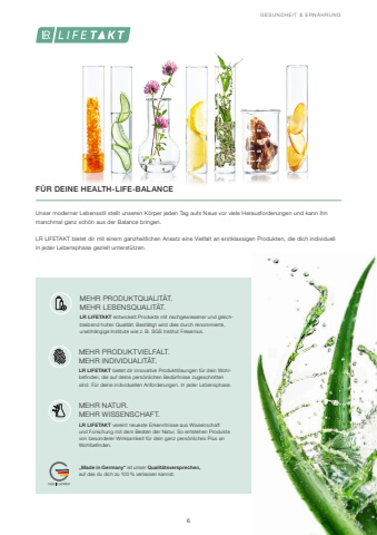 6GESUNDHEIT & ERN%u00c4HRUNGUnser moderner Lebensstil stellt unseren K%u00f6rper jeden Tag aufs Neue vor viele Herausforderungen und kann ihn manchmal ganz sch%u00f6n aus der Balance bringen. LR LIFETAKT bietet dir mit einem ganzheitlichen Ansatz eine Vielfalt an erstklassigen Produkten, die dich individuell in jeder Lebensphase gezielt unterst%u00fctzen.F%u00dcR DEINE HEALTH-LIFE-BALANCE%u201eMade in Germany%u201c ist unser Qualit%u00e4tsversprechen,auf das du dich zu 100% verlassen kannst.MEHR PRODUKTVIELFALT.MEHR INDIVIDUALIT%u00c4T.LR LIFETAKT bietet dir innovative Produktl%u00f6sungen f%u00fcr dein Wohlbefinden, die auf deine pers%u00f6nlichen Bed%u00fcrfnisse zugeschnitten sind. F%u00fcr deine individuellen Anforderungen. In jeder Lebensphase. MEHR NATUR.MEHR WISSENSCHAFT.LR LIFETAKT vereint neueste Erkenntnisse aus Wissenschaft und Forschung mit dem Besten der Natur. So entstehen Produkte von besonderer Wirksamkeit f%u00fcr dein ganz pers%u00f6nliches Plus an Wohlbefinden.MEHR PRODUKTQUALIT%u00c4T.MEHR LEBENSQUALIT%u00c4T.LR LIFETAKT entwickelt Produkte mit nachgewiesener und gleichbleibend hoher Qualit%u00e4t. Best%u00e4tigt wird dies durch renommierte, unabh%u00e4ngige Institute wie z. B. SGS Institut Fresenius.