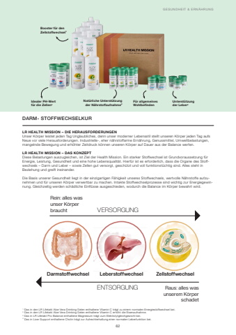 ENTSORGUNG Raus: alles was unserem K%u00f6rper schadetDarmstoffwechsel Leberstoffwechsel ZellstoffwechselVERSORGUNGRein: alles was unser K%u00f6rper braucht62GESUNDHEIT & ERN%u00c4HRUNGBooster f%u00fcr denZellstoffwechsel1Idealer PH-Wertf%u00fcr die Zellen3Nat%u00fcrliche Unterst%u00fctzung der N%u00e4hrstoffaufnahme2F%u00fcr allgemeinesWohlbefindenUnterst%u00fctzung der Leber4LR HEALTH MISSION %u2013 DIE HERAUSFORDERUNGENUnser K%u00f6rper leistet jeden Tag Unglaubliches, denn unser moderner Lebensstil stellt unseren K%u00f6rper jeden Tag aufs Neue vor viele Herausforderungen. Industrielle-, eher n%u00e4hrstoffarme Ern%u00e4hrung, Genussmittel, Umweltbelastungen, mangelnde Bewegung und erh%u00f6hter Zeitdruck k%u00f6nnen unseren K%u00f6rper auf Dauer aus der Balance werfen. LR HEALTH MISSION %u2013 DAS KONZEPTDiese Belastungen auszugleichen, ist Ziel der Health Mission. Ein starker Stoffwechsel ist Grundvoraussetzung f%u00fcr Energie, Leistung, Gesundheit und eine hohe Lebensqualit%u00e4t. Hierf%u00fcr ist es erforderlich, dass die Organe des Stoffwechsels %u2013 Darm und Leber %u2013 sowie Zellen gut versorgt, gesch%u00fctzt und voll funktionst%u00fcchtig sind. Alles steht in Beziehung und greift ineinander.Die Basis unserer Gesundheit liegt in der einzigartigen F%u00e4higkeit unseres Stoffwechsels, wertvolle N%u00e4hrstoffe aufzunehmen und f%u00fcr unseren K%u00f6rper verwertbar zu machen. Intakte Stoffwechselprozesse sind wichtig zur Energiegewinnung. Gleichzeitig werden sch%u00e4dliche Einfl%u00fcsse ausgeschieden, wodurch die Balance im K%u00f6rper bewahrt wird.DARM- STOFFWECHSELKUR1 Das in den LR Lifetakt Aloe Vera Drinking Gelen enthaltene Vitamin C tr%u00e4gt zu einem normalen Energiestoffwechsel bei.2 Das in den LR Lifetakt Aloe Vera Drinking Gelen enthaltene Vitamin C erh%u00f6ht die Eisenaufnahme.3 Das in LR Lifetakt Pro Balance enthaltene Magnesium tr%u00e4gt zum Elektrolytgleichgewicht bei. 4 Das in Liver Support enthaltene Cholin tr%u00e4gt zur Aufrechterhaltung einer normalen Leberfunktion bei.