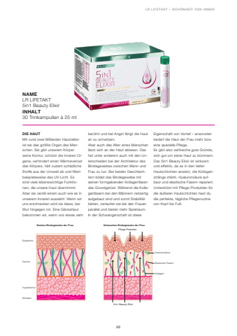 Schwaches Bindegewebe der FrauHyalurons%u00e4urePflege Produkte5in1 Beauty ElixirElastische FasernKollagenStarkes Bindegewebe der FrauEpidermisDermisHypodermisMuskeln66GESUNDHEIT & ERN%u00c4HRUNGNAMELR LIFETAKT5in1 Beauty ElixirINHALT30 Trinkampullen %u00e0 25 mlDIE HAUTMit rund zwei Milliarden Hautzellen ist sie das gr%u00f6%u00dfte Organ des Menschen. Sie gibt unserem K%u00f6rper seine Kontur, sch%u00fctzt die inneren Organe, verhindert einen W%u00e4rmeverlust des K%u00f6rpers, h%u00e4lt zudem sch%u00e4dliche Stoffe aus der Umwelt ab und filtert beispielsweise das UV-Licht. Es sind viele lebenswichtige Funktionen, die unsere Haut %u00fcbernimmt. Aber sie verr%u00e4t einem auch wie es in unserem Inneren aussieht. Wenn wir uns erschrecken wird sie blass, bei Wut hingegen rot. Eine G%u00e4nsehaut bekommen wir, wenn uns etwas sehr ber%u00fchrt und bei Angst f%u00e4ngt die Haut an zu schwitzen.Aber auch das Alter eines Menschen l%u00e4sst sich an der Haut ablesen. Das hat unter anderem auch mit den Unterschieden bei der Architektur des Bindegewebes zwischen Mann und Frau zu tun. Bei beiden Geschlechtern bildet das Bindegewebe mit seinen formgebenden Kollagenfasen das Grundger%u00fcst. W%u00e4hrend die Kollagenfasern bei den M%u00e4nnern netzartig aufgebaut sind und somit Stabilit%u00e4t bieten, verlaufen sie bei den Frauen parallel und bieten mehr Spielraum. In der Schwangerschaft ist diese Eigenschaft von Vorteil %u2013 ansonsten bedarf die Haut der Frau mehr bzw. eine spezielle Pflege. Es gibt also zahlreiche gute Gr%u00fcnde, sich gut um seine Haut zu k%u00fcmmern. Das 5in1 Beauty Elixir ist wirksam und effektiv, da es in den tiefen Hautschichten ansetzt, die Kollagenstr%u00e4nge st%u00e4rkt, Hyalurons%u00e4ure aufbaut und elastische Fasern repariert. Unterst%u00fctzt mit Pflege-Produkten f%u00fcr die %u00e4u%u00dferen Hautschichten hast du die perfekte, t%u00e4gliche Pflegeroutine von Kopf bis Fu%u00df. LR LIFETAKT %u2013 SCH%u00d6NHEIT VON INNEN