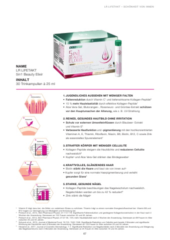 1.Faltenreduktion2. Hautschutz4. Haarst%u00e4rkePlacebo1,000,940,950,960,970,980,99Kollagen3. HautdichteRelative Hautdichtet=0 t=12 t=241,150,900,951,001,051,105.NagelwachstumVerbesserung des Nagelwachstums67GESUNDHEIT & ERN%u00c4HRUNG1.JUGENDLICHES AUSSEHEN MIT WENIGER FALTEN%u2022 Faltenreduktion durch Vitamin C1 und tiefenwirksame Kollagen-Peptide6%u2022 15 % mehr Hautelastizit%u00e4t durch effektive Kollagen-Peptide7%u2022 Aloe Vera-Gel, Blutorangen-, Rosenwurz- und Gr%u00fcntee-Extrakt sch%u00fctzen vor den Hauptursachen der Alterung, wie z. B. UV-Strahlung2.REINES, GESUNDES HAUTBILD OHNE IRRITATION%u2022 Schutz vor externen Umwelteinfl%u00fcssen durch Blaubeer- Extrakt und Vitamin E5 %u2022 Verbesserte Hautfunktion und -pigmentierung mit den hochkonzentrierten Vitaminen A, E, Thiamin, Riboflavin, Niacin, B6, Biotin, B12, C sowie Zink als essenzielles Spurenelement13.STRAFFER K%u00d6RPER MIT WENIGER CELLULITE%u2022 Kollagen-Peptide steigern die Hautdichte und reduzieren Cellulitenachweislich8%u2022 Kupfer2 und Aloe Vera-Gel st%u00e4rken das Bindegewebe24.KRAFTVOLLES, GL%u00c4NZENDES HAAR%u2022 Biotin st%u00e4rkt die Haare und baut sie von innen auf3%u2022 Kupfer sorgt f%u00fcr eine normale Haarpigmentierung und verleiht gesunden Glanz35.STARKE, GESUNDE N%u00c4GEL%u2022 Kollagen-Peptide beschleunigen das Nagelwachstum nachweislich. Nagelsch%u00e4den werden um bis zu 42 % reduziert9%u2022 Zink st%u00e4rkt die N%u00e4gel4NAMELR LIFETAKT5in1 Beauty ElixirINHALT30 Trinkampullen %u00e0 25 ml5 Vitamin E tr%u00e4gt dazu bei, die Zellen vor oxidativem Stress zu sch%u00fctzen. Thiamin tr%u00e4gt zu einem normalen Energiestoffwechsel bei. Vitamin B6 und B12 tragen zur Verringerung von M%u00fcdigkeit und Erm%u00fcdung bei. 6 Proksch et al., 2014, Skin Pharmacol Physiol; 27:113-119. Signifikante Faltenreduktion und gestiegene Kollagenkonzentration in der Haut nach 4 Wochen der Anwendung. Gemessen an 100 Frauen zwischen 45 und 65 Jahren. 7 Proksch et al., 2014, Skin Pharmacol Physiol; 27:47-55. 15% mehr Hautelastizit%u00e4t nach 4 Wochen der Anwendung. Gemessen an 69 Frauen im Alter zwischen 35 und 55 Jahren. 8 Schunck et al., 2015, Journal of Medicinal Food; 18 (12): 1340-1348. Signifikante Reduktion von Cellulite nach bereits 3 Monaten und signifikante Erh%u00f6hung der Hautdichte nach 6 Monaten der Anwendung. Gemessen an 105 Frauen im Alter zwischen 25 und 50 Jahren. 9 Hexsel et al., 2017, Journal of Cosmetic Dermatology; 1-7. Signifikante Reduktion von Nagelsch%u00e4den nach 2 Monaten der Anwendung und Steigerung des Nagelwachstums nach 3 Monaten der Anwendung. Gemessen an 25 Frauen im Alter zwischen 18 und 50 Jahren.LR LIFETAKT %u2013 SCH%u00d6NHEIT VON INNEN