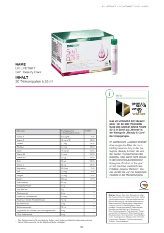 69GESUNDHEIT & ERN%u00c4HRUNGMADE IN GERMANYNAMELR LIFETAKT5in1 Beauty ElixirINHALT30 Trinkampullen %u00e0 25 mlZutaten Wasser, Aloe Vera (Barbadensis Miller) Gel, Agavendicksaft, Kollagenhydrolysat, wei%u00dfes Traubensaftkonzentrat, Orangensaftkonzentrat, Birnensaftkonzentrat, Aprikosensaftkonzentrat, S%u00e4uerungsmittel (Citronens%u00e4ure), Magnesiumcarbonat, Aroma, L-Ascorbins%u00e4ure, Hyalurons%u00e4ure, Konservierungsstoff (Kaliumsorbat), Verdickungsmittel (Xanthan), Nicotinamid, DL-%u03b1-Tocopherolacetat, Retinylpalmitat, Rosenwurzextrakt, Zinkgluconat, Blutorangenextrakt, Blaubeerextrakt, Gr%u00fcnteeextrakt, Citrus Bioflavonoide, Kupfergluconat, Mangansulfat, Pyridoxinhydrochlorid, Riboflavin, Thiaminhydrochlorid, D-Biotin, Cyanocobalamin.i INFO* Des Referenzwerts f%u00fcr die t%u00e4gliche Zufuhr nach Lebensmittelinformationsverordnung ** Keine Referenzwerte f%u00fcr die t%u00e4gliche Zufuhr verf%u00fcgbarN%u00e4hrwerte Pro Tagesportion (1 Trinkampulle %u00e0 25 ml)% NRV*Vitamin A 600 %u00b5g RE 75 %Vitamin E 12 mg %u03b1-TE 100 %Thiamin 1,1 mg 100 %Riboflavin 1,4 mg 100 %Niacin 16 mg NE 100 %Vitamin B6 1,4 mg 100 %Vitamin B12 2,5 %u00b5g 100 %Biotin 50 %u00b5g 100 %Vitamin C 80 mg 100 %Magnesium 56,3 mg 15 %Zink 1,5 mg 15 %Mangan 0,5 mg 25 %Kupfer 270 %u00b5g 27 %Hyalurons%u00e4ure 50 mg **Kollagenhydrolysat 2,5 g **Aloe Vera Gel 5 g **Gr%u00fcnteeextrakt 9 mg **Koffein aus Gr%u00fcnteeextrakt 0,8 mg **Rosenwurz Extrakt (Rhodiola Rosea) 10 mg **Blaubeerextrakt 3 mg **Blutorangenextrakt 10 mg **Polyphenole aus Gr%u00fcntee- und Blutorangenextrakt 8 mg **Citrus Bioflavonoide 3 mg **LR LIFETAKT %u2013 SCH%u00d6NHEIT VON INNEN Das LR LIFETAKT 5in1 Beauty Elixir ist bei der Preisverleihung des German Brand Award 2019 in Berlin als ,Winner%u2018 in der Kategorie %u201eBeauty & Care%u201c hervorgegangen.Im Wettbewerb %u201eExcellent Brands%u201c %u00fcberzeugte das Elixir die hochkar%u00e4tig besetzte Jury in der Kategorie %u201eBeauty & Care%u201c als eine der besten Produktmarken der Branche. Aber damit nicht genug: In der branchen%u00fcbergreifenden Kategorie %u201eProduct of the year%u201c erhielt das Elixir zus%u00e4tzlich das Pr%u00e4dikat %u201eSpecial Mention%u201c. Dieses vergibt die Jury f%u00fcr besondere Aspekte in der Markenf%u00fchrung.