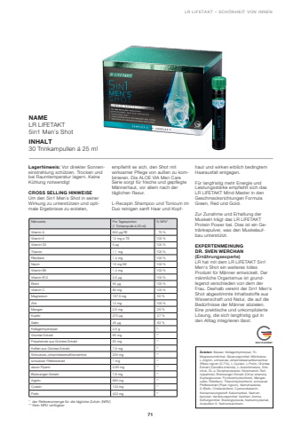 71MADE IN GERMANYNAMELR LIFETAKT5in1 Men%u00b4s ShotINHALT30 Trinkampullen %u00e1 25 mlLagerhinweis: Vor direkter Sonneneinstrahlung sch%u00fctzen. Trocken undbei Raumtemperatur lagern. KeineK%u00fchlung notwendig!CROSS SELLING HINWEISEUm den 5in1 Men%u00b4s Shot in seinerWirkung zu unterst%u00fctzen und optimale Ergebnisse zu erzielen, empfiehlt es sich, den Shot mit wirksamer Pflege von au%u00dfen zu kombinieren. Die ALOE VIA Men Care Serie sorgt f%u00fcr frische und gepflegte M%u00e4nnerhaut, vor allem nach der t%u00e4glichen Rasur. L-Recapin Shampoo und Tonicum im Duo reinigen sanft Haar und Kopfhaut und wirken erblich bedingtem Haarausfall entgegen. F%u00fcr langfristig mehr Energie und Leistungsst%u00e4rke empfiehlt sich das LR LIFETAKT Mind Master in den Geschmacksrichtungen Formula Green, Red und Gold. Zur Zunahme und Erhaltung der Muskeln tr%u00e4gt das LR LIFETAKT Protein Power bei. Dies ist ein Getr%u00e4nkepulver, was den Muskelaufbau unterst%u00fctzt.EXPERTENMEINUNG DR. SVEN WERCHAN (Ern%u00e4hrungsexperte)LR hat mit dem LR LIFETAKT 5in1 Men%u2018s Shot ein weiteres tolles Produkt f%u00fcr M%u00e4nner entwickelt. Der m%u00e4nnliche Organismus ist grundlegend verschieden von dem der Frau. Deshalb vereint der 5in1 Men%u2018s Shot abgestimmte Inhaltsstoffe aus Wissenschaft und Natur, die auf die Bed%u00fcrfnisse der M%u00e4nner abzielen. Eine praktische und unkomplizierte L%u00f6sung, die sich langfristig gut in den Alltag integrieren l%u00e4sst. Zutaten: Wasser, Kollagenhydrolysat, TriMagnesiumdicitrat, S%u00e4uerungsmittel: Milchs%u00e4ure; L-Arginin, schwarzes Johannisbeersaftkonzentrat (Ribes nigrum (0,7%)), L-Cystein, L-Prolin, Gr%u00fcntee Extrakt (Camellia sinensis), L-Ascorbins%u00e4ure, Zinkcitrat, DL-a-Tocopherylacetat, Nicotinamid, Retinylpalmitat, Blutorangen Extrakt (Citrus sinensis), Kupfergluconat, Pyridoxinhydrochlorid, Mangansulfat, Riboflavin, Thiaminhydrochlorid, schwarzer Pfefferextrakt (Piper nigrum), Natriumselenat, D-Biotin, Cholecalciferol, Cyanocobalamin, Konservierungsstoff: Kaliumsorbat, Natriumbenzoat; Verdickungsmittel: Xanthan; Aroma, S%u00fc%u00dfungsmittel: Steviolglycoside, Natriumcyclamat, Acesulfam K, Natriumsaccharin. * der Referenzmenge f%u00fcr die t%u00e4gliche Zufuhr (NRV)** Kein NRV verf%u00fcgbarN%u00e4hrwerte Pro Tagesportion (1 Trinkampulle %u00e0 25 ml)% NRV*Vitamin A 600 %u03bcg RE 75 %Vitamin E 12 mg %u03b1-TE 100 %Vitamin D3 5 %u03bcg 100 %Thiamin 1,1 mg 100 %Riboflavin 1,4 mg 100 %Niacin 16 mg NE 100 %Vitamin B6 1,4 mg 100 %Vitamin B12 2,5 %u03bcg 100 %Biotin 50 %u03bcg 100 %Vitamin C 80 mg 100 %Magnesium 187,5 mg 50 %Zink 10 mg 100 %Mangan 0,5 mg 25 %Kupfer 270 %u03bcg 27 %Selen 45 %u03bcg 82 %Kollagenhydrolysat 2,5 g **Gr%u00fcntee Extrakt 90 mg **Polyphenole aus Gr%u00fcntee Extrakt 50 mg **Koffein aus Gr%u00fcntee Extrakt 7,5 mg **Schwarzes Johannisbeersaftkonzentrat 200 mg **schwarzer Pfefferextrakt 1 mg **davon Piperin 0,95 mg **Blutorangen Extrakt 7,8 mg **Arginin 690 mg **Cystein 100 mg **Prolin 432 mg **71LR LIFETAKT %u2013 SCH%u00d6NHEIT VON INNEN