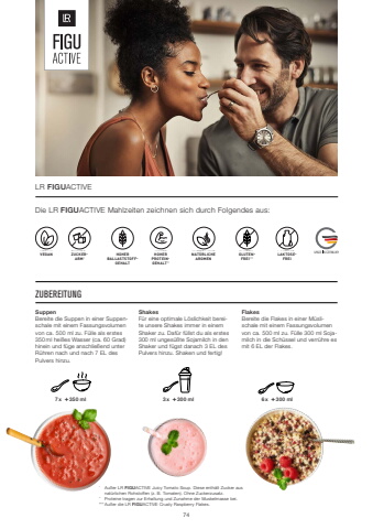 74VEGAN VEGAN ZUCKERARM*ZUCKERFREI HOHERBALLASTSTOFFGEHALTBALLAST- STOFFQUELLENAT%u00dcRLICHE AROMENNAT%u00dcRLICHEAROMEN HOHERPROTEINGEHALT**HOHER PROTEINGEHALT GLUTENFREI***GLUTENFREI LAKTOSEFREILAKTOSEFREILR FIGUACTIVEDie LR FIGUACTIVE Mahlzeiten zeichnen sich durch Folgendes aus:ZUBEREITUNGSuppenBereite die Suppen in einer Suppenschale mit einem Fassungsvolumen von ca. 500 ml zu. F%u00fclle als erstes 350 ml hei%u00dfes Wasser (ca. 60 Grad) hinein und f%u00fcge anschlie%u00dfend unter R%u00fchren nach und nach 7 EL des Pulvers hinzu. ShakesF%u00fcr eine optimale L%u00f6slichkeit bereite unsere Shakes immer in einem Shaker zu. Daf%u00fcr f%u00fcllst du als erstes 300 ml unges%u00fc%u00dfte Sojamilch in den Shaker und f%u00fcgst danach 3 EL des Pulvers hinzu. Shaken und fertig!Flakes Bereite die Flakes in einer M%u00fcslischale mit einem Fassungsvolumen von ca. 500 ml zu. F%u00fclle 300 ml Sojamilch in die Sch%u00fcssel und verr%u00fchre es mit 6 EL der Flakes. 7 x +350 ml 3 x +300 ml* Au%u00dfer LR FIGUACTIVE Juicy Tomato Soup. Diese enth%u00e4lt Zucker aus nat%u00fcrlichen Rohstoffen (z. B. Tomaten). Ohne Zuckerzusatz. ** Proteine tragen zur Erhaltung und Zunahme der Muskelmasse bei. *** Au%u00dfer die LR FIGUACTIVE Crusty Raspberry Flakes.6 x +300 ml