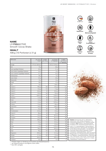 75GESUNDHEIT & ERN%u00c4HRUNGLR BODY MISSION | LR FIGUACTIVE | ShakesZutaten: Erbsenprotein (39 %), Maltodextrin, Kokosnuss%u00f6l, stark ent%u00f6ltes Kakaopulver (7 %), Flohsamenschalenpulver (6 %), nat%u00fcrliche Aromen, Emulgator: Soja-Lecithine; Kichererbseneiwei%u00dfKonzentrat (2 %), Ackerbohneneiwei%u00df-Isolat (2 %), Inulin (1 %), Calciumphosphat, Calciumcarbonat, Magnesiumhydroxid, S%u00fc%u00dfungsmittel: Steviolglycoside aus Stevia; Kaliumphosphat, L-Ascorbins%u00e4ure,Trennmittel: Siliciumdioxid; Speisesalz, Zinkoxid, Nicotinamid, Eisenpyrophosphat, Calcium-Dpantothenat, Antioxidationsmittel: alpha-Tocopherol; Mangansulfat, D-%u03b1-Tocopherylacetat, Kupfercarbonat, Riboflavin, Pyridoxinhydrochlorid, Thiaminmononitrat, Retinylacetat, Natriumiodid, Pteroylmonoglutamins%u00e4ure, Natriumselenit, Phyllochinon, D-Biotin, Cholecalciferol, Cyanocobalamin.NAMELR FIGUACTIVESmooth Cocoa ShakeINHALT496 g (16 Portionen %u00e0 31 g)N%u00e4hrwerte pro 100 g Pulver% NRV** pro 100 gpro Portion (=1 Mahlzeit)% NRV**,pro Portion (=1 Mahlzeit)Energie 1771 kJ / 423 kcal 912 kJ / 218 kcalFett 15 g 6,9 gdavon ges%u00e4ttigte Fetts%u00e4uren 9,0 g 3,1 gdavon einfach unges%u00e4ttigte Fetts%u00e4uren 2,4 g 1,2 gdavon mehrfach unges%u00e4ttigte Fetts%u00e4uren 3,1 g 2,4 gKohlenhydrate 29 g 14 gdavon Zucker 2,5 g 2,6 gBallaststoffe 13 g 7,3 gEiwei%u00df 36 g 21 gSalz 1,6 g 0,64 gVitamin A 796 %u03bcg 100 247 %u03bcg 31Vitamin D 5,5 %u03bcg 110 1,7 %u03bcg 34Vitamin E 6,6 mg 55 9,5 mg 79Vitamin C 82 mg 103 25 mg 31Thiamin 0,96 mg 87 0,48 mg 44Riboflavin 1,2 mg 86 0,47 mg 34Niacin 14 mg 88 6,9 mg 43Vitamin B6 1,2 mg 86 0,53 mg 38Fols%u00e4ure 174 %u03bcg 87 162 %u03bcg 81Vitamin B12 2,8 %u03bcg 112 0,86 %u03bcg 34Biotin 44 %u03bcg 88 19 %u03bcg 38Pantothens%u00e4ure 6,0 mg 100 1,9 mg 32Vitamin K 69 %u03bcg 92 31 %u03bcg 41Calcium 737 %u03bcg 92 267 mg 33Phosphor 757 %u03bcg 108 391 mg 56Kalium 623 %u03bcg 31 703 mg 35Eisen 16 mg 114 6,5 mg 46Zink 11 mg 110 3,3 mg 33Kupfer 1,4 mg 140 0,78 mg 78Jod 169 %u03bcg 113 58,5 %u03bcg 39Selen 78 %u03bcg 142 24 %u03bcg 44Magnesium 252 mg 67 141 mg 38Mangan 2,1 mg 105 1,3 mg 65Natrium 640 mg *** 256 mg ***Linols%u00e4ure 2,0 g *** 1,8 g ***GlutenFreiGLUTENFREILaktoseFreiLAKTOSEFREINAT%u00dcRLICHE Nat%u00fcrliche AROMENAromenHoher Proteingehalt*Hoher BallaststoffgehaltZuckerarmVegan* Proteine tragen zur Erhaltung und Zunahme der Muskelmasse bei.** der Referenzmenge f%u00fcr die t%u00e4gliche Zufuhr (NRV) *** Kein NRV verf%u00fcgbar