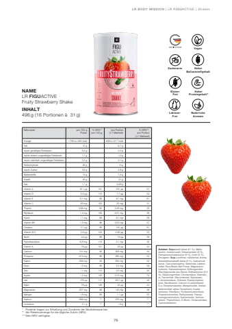76LR BODY MISSIONGESUNDHEIT & ERN%u00c4HRUNG | LR FIGUACTIVE | ShakesN%u00e4hrwerte pro 100 g Pulver% NRV** pro 100 gpro Portion (=1 Mahlzeit)% NRV**,pro Portion (=1 Mahlzeit)Energie 1759 kJ (420 kcal) 908 kJ (217 kcal)Fett 15 g 6,7 gdavon ges%u00e4ttigte Fetts%u00e4uren 9,3 g 3,3 gdavon einfach unges%u00e4ttigte Fetts%u00e4uren 1,7 g 1,0 gdavon mehrfach unges%u00e4ttigte Fetts%u00e4uren 2,2 g 2,1 gKohlenhydrate 29 g 14 gdavon Zucker 3,6 g 2,9 gBallaststoffe 13 g 7,3 gEiwei%u00df 35 g 21 gSalz 1,7 g 0,68 gVitamin A 811 %u03bcg 101 251 %u03bcg 31Vitamin D 5,5 %u03bcg 110 1,7 %u03bcg 34Vitamin E 8,1 mg 68 9,7 mg 81Vitamin C 82 mg 103 25 mg 31Thiamin 0,66 mg 60 0,38 mg 35Riboflavin 1,4 mg 100 0,51 mg 36Niacin 11 mg 69 6,1 mg 38Vitamin B6 1,2 mg 86 0,52 mg 37Fols%u00e4ure 171 %u03bcg 86 161 %u03bcg 81Vitamin B12 2,6 %u03bcg 104 0,82 %u03bcg 33Biotin 44 %u03bcg 88 19 %u03bcg 38Pantothens%u00e4ure 6,8 mg 113 2,1 mg 35Vitamin K 76 %u03bcg 101 33 %u03bcg 44Calcium 741 mg 93 269 mg 34Phosphor 674 mg 96 365 mg 52Kalium 394 mg 20 632 mg 32Eisen 12 mg 86 5,5 mg 39Zink 11 mg 110 3,5 mg 35Kupfer 1,2 mg 120 0,72 mg 72Jod 176 %u03bcg 117 60,7 %u03bcg 40Selen 76 %u03bcg 138 24 %u03bcg 44Magnesium 257 mg 69 143 mg 38Mangan 1,6 mg 80 1,1 %u03bcg 55Natrium 686 mg *** 270 mg ***Linols%u00e4ure 2,1 g *** 1,9 g ***NAMELR FIGUACTIVEFruity Strawberry ShakeINHALT496 g (16 Portionen %u00e0 31 g)Zutaten: Sojaeiwei%u00df-Isolat (31 %), Maltodextrin, Kokosnuss%u00f6l, Erbsenprotein (8 %), Flohsamenschalenpulver (6 %), Inulin (5 %), Emulgator: Soja-Lecithine; nat%u00fcrliches Aroma, Ackerbohneneiwei%u00df-Isolat (2 %), Calciumcarbonat, Calciumphosphat, f%u00e4rbendes Lebensmittel: Rote Beete Saft Pulver; Magnesiumhydroxid, Kaliumphosphat, S%u00fc%u00dfungsmittel: Steviolglycoside aus Stevia; Erdbeerpulver (0,2 %), S%u00e4uerungsmittel: Citronens%u00e4ure, Weins%u00e4ure; Trennmittel: Siliciumdioxid; Speisesalz, L-Ascorbins%u00e4ure, Zinkoxid, Eisenpyrophosphat, Nicotinamid, Calcium-D-pantothenat, D-%u03b1-Tocopherylacetat, Mangansulfat, Antioxidationsmittel: alpha-Tocopherol; Kupfercarbonat, Riboflavin, Pyridoxinhydrochlorid, Thiaminmononitrat, Retinylacetat, Pteroylmonoglutamins%u00e4ure, Natriumiodid, Natriumselenit, Phyllochinon, D-Biotin, Cholecalciferol, Cyanocobalamin.* Proteine tragen zur Erhaltung und Zunahme der Muskelmasse bei.** der Referenzmenge f%u00fcr die t%u00e4gliche Zufuhr (NRV) *** Kein NRV verf%u00fcgbar GlutenFreiGLUTENFREILaktoseFreiLAKTOSEFREINAT%u00dcRLICHE Nat%u00fcrliche AROMENAromenHoher Proteingehalt*Hoher BallaststoffgehaltZuckerarmVegan