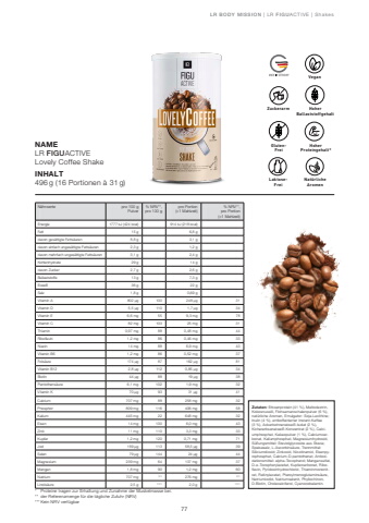 77LR BODY MISSIONGESUNDHEIT & ERN%u00c4HRUNG | LR FIGUACTIVE | ShakesN%u00e4hrwerte pro 100 gPulver% NRV**, pro 100 gpro Portion (=1 Mahlzeit)% NRV**,pro Portion (=1 Mahlzeit)Energie 1777 kJ (424 kcal) 914 kJ (218 kcal)Fett 15 g 6,8 gdavon ges%u00e4ttigte Fetts%u00e4uren 8,8 g 3,1 gdavon einfach unges%u00e4ttigte Fetts%u00e4uren 2,3 g 1,2 gdavon mehrfach unges%u00e4ttigte Fetts%u00e4uren 3,1 g 2,4 gKohlenhydrate 29 g 14 gdavon Zucker 2,7 g 2,6 gBallaststoffe 13 g 7,3 gEiwei%u00df 36 g 22 gSalz 1,8 g 0,69 gVitamin A 802 %u03bcg 100 248 %u03bcg 31Vitamin D 5,5 %u03bcg 110 1,7 %u03bcg 34Vitamin E 6,6 mg 55 9,3 mg 78Vitamin C 82 mg 103 25 mg 31Thiamin 0,97 mg 88 0,48 mg 44Riboflavin 1,2 mg 86 0,46 mg 33Niacin 14 mg 88 6,9 mg 43Vitamin B6 1,2 mg 86 0,52 mg 37Fols%u00e4ure 174 %u03bcg 87 162 %u03bcg 81Vitamin B12 2,8 %u03bcg 112 0,85 %u03bcg 34Biotin 44 %u03bcg 88 19 %u03bcg 38Pantothens%u00e4ure 6,1 mg 102 1,9 mg 32Vitamin K 70 %u03bcg 93 31 %u03bcg 41Calcium 707 mg 88 258 mg 32Phosphor 809 mg 116 406 mg 58Kalium 445 mg 22 648 mg 32Eisen 14 mg 100 6,0 mg 43Zink 11 mg 110 3,3 mg 33Kupfer 1,2 mg 120 0,71 mg 71Jod 169 %u03bcg 113 58,5 %u03bcg 39Selen 79 %u03bcg 144 24 %u03bcg 44Magnesium 239 mg 64 137 mg 37Mangan 1,8 mg 90 1,2 mg 60Natrium 707 mg *** 276 mg ***Linols%u00e4ure 2,5 g **** 2,0 g ****NAMELR FIGUACTIVELovely Coffee ShakeINHALT496 g (16 Portionen %u00e0 31 g)Zutaten: Erbsenprotein (41 %), Maltodextrin, Kokosnuss%u00f6l, Flohsamenschalenpulver (6 %), nat%u00fcrliche Aromen, Emulgator: Soja-Lecithine; Inulin (4 %), entkoffeinierter Instant-Kaffee (3 %), Ackerbohneneiwei%u00df-Isolat (2 %), Kichererbseneiwei%u00df-Konzentrat (2 %), Calciumphosphat, Kakaopulver (1 %), Calciumcarbonat, Kaliumphosphat, Magnesiumhydroxid, S%u00fc%u00dfungsmittel: Steviolglycoside aus Stevia; Speisesalz, L-Ascorbins%u00e4ure, Trennmittel: Siliciumdioxid; Zinkoxid, Nicotinamid, Eisenpyrophosphat, Calcium-D-pantothenat, Antioxidationsmittel: alpha-Tocopherol; Mangansulfat, D-%u03b1-Tocopherylacetat, Kupfercarbonat, Riboflavin, Pyridoxinhydrochlorid, Thiaminmononitrat, Retinylacetat, Pteroylmonoglutamins%u00e4ure, Natriumiodid, Natriumselenit, Phyllochinon, D-Biotin, Cholecalciferol, Cyanocobalamin.* Proteine tragen zur Erhaltung und Zunahme der Muskelmasse bei.** der Referenzmenge f%u00fcr die t%u00e4gliche Zufuhr (NRV) *** Kein NRV verf%u00fcgbar GlutenFreiGLUTENFREILaktoseFreiLAKTOSEFREINAT%u00dcRLICHE Nat%u00fcrliche AROMENAromenHoher Proteingehalt*Hoher BallaststoffgehaltZuckerarmVegan