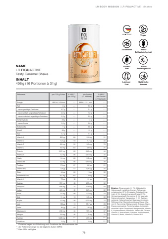 78GESUNDHEIT & ERN%u00c4HRUNGNAMELR FIGUACTIVETasty Caramel ShakeINHALT496 g (16 Portionen %u00e0 31 g)N%u00e4hrwerte pro 100 g Pulver % NRV**, pro 100 gpro Portion (=1 Mahlzeit)% NRV**,pro Portion(=1 Mahlzeit)Energie 1682 kJ / 401kcal ---- 889 kJ / 211 kcal ----Fett 14 g ---- 6,5 g ----- davon ges%u00e4ttigte Fetts%u00e4uren 8,7 g ---- 3,1 g ----- davon einfach unges%u00e4ttigte Fetts%u00e4uren 2,3 g ---- 1,2 g ----- davon mehrfach unges%u00e4ttigte Fetts%u00e4uren 2,5 g ---- 2,2 g ----Kohlenhydrate 29 g ---- 14 g ----- davon Zucker 3,2 g ---- 2,8 g ----Ballaststoffe 11 g ---- 6,6 g ----Eiwei%u00df 36 g ---- 21 g ----Salz 3,1 g ---- 1,1 g ----Vitamin A 802 %u03bcg 100 248 %u03bcg 31Vitamin D 5,5 %u03bcg 110 1,7 %u03bcg 34Vitamin E 6,6 mg 55 9,3 mg 78Vitamin C 82 mg 103 25 mg 31Thiamin 0,97 mg 88 0,48 mg 44Riboflavin 1,2 mg 86 0,47 mg 34Niacin 14 mg 88 6,9 mg 43Vitamin B6 1,2 mg 86 0,53 mg 38Fols%u00e4ure 174 %u03bcg 87 162 %u03bcg 81Vitamin B12 2,8 %u03bcg 112 0,86 %u03bcg 34Biotin 44 %u03bcg 88 19 %u03bcg 38Pantothens%u00e4ure 6,1 mg 102 1,9 mg 32Vitamin K 70 %u03bcg 93 31 %u03bcg 41Calcium 707 mg 88 258 mg 32Phosphor 808 mg 115 406 mg 58Kalium 445 mg 22 647 mg 32Eisen 14 mg 100 6,0 mg 43Zink 11 mg 110 3,3 mg 33Kupfer 1,2 mg 120 0,72 mg 72Jod 169 %u03bcg 113 58,7 %u03bcg 39Selen 84 %u03bcg 153 26 %u03bcg 47Magnesium 239 mg 64 137 mg 37Mangan 2,9 mg 145 1,5 mg 75Natrium 1226 mg **** 437 mg ****Linols%u00e4ure 2,0 g **** 1,9 g ****Zutaten: Erbsenprotein (41 %), Maltodextrin, Kokosnuss%u00f6l, nat%u00fcrliche Aromen, Flohsamenschalenpulver (6 %), Emulgator: Soja-Lecithine; Inulin (4 %), Ackerbohneneiwei%u00df-Isolat (2 %), Kichererbseneiwei%u00df-Konzentrat (2 %), Meersalz, Calciumphosphat, Kakaopulver (1 %), Calciumcarbonat, Kaliumphosphat, Magnesiumhydroxid, S%u00fc%u00dfungsmittel: Steviolglycoside aus Stevia; Vitamin C, Trennmittel: Siliciumdioxid; Zinkoxid, Niacin, Eisenpyrophosphat, Pantothens%u00e4ure, Antioxidationsmittel: alpha-Tocopherol; Mangansulfat, Vitamin E, Kupfercarbonat, Riboflavin, Vitamin B6, Thiamin, Vitamin A, Natriumiodid, Fols%u00e4ure, Natriumselenit, Vitamin K, Biotin, Vitamin D, Vitamin B12.GlutenFreiGLUTENFREILaktoseFreiLAKTOSEFREINAT%u00dcRLICHE Nat%u00fcrliche AROMENAromenHoher Proteingehalt*Hoher BallaststoffgehaltZuckerarmVeganLR BODY MISSION | LR FIGUACTIVE | Shakes* Proteine tragen zur Erhaltung und Zunahme der Muskelmasse bei.** der Referenzmenge f%u00fcr die t%u00e4gliche Zufuhr (NRV) *** Kein NRV verf%u00fcgbar