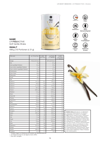 79LR BODY MISSIONGESUNDHEIT & ERN%u00c4HRUNG | LR FIGUACTIVE | ShakesNAMELR FIGUACTIVESoft Vanilla ShakeINHALT496 g (16 Portionen %u00e0 31 g)N%u00e4hrwerte pro 100 g Pulver % NRV**, pro 100 gpro Portion (=1 Mahlzeit)% NRV**,pro Portion(=1 Mahlzeit)Energie 1754 kJ (419 kcal) 907 kJ (216 kcal)Fett 15 g 6,7 gdavon ges%u00e4ttigte Fetts%u00e4uren 9,4 g 3,3 gdavon einfach unges%u00e4ttigte Fetts%u00e4uren 1,7 g 1,0 gdavon mehrfach unges%u00e4ttigte Fetts%u00e4uren 2,2 g 2,1 gKohlenhydrate 30 g 14 gdavon Zucker 3,8 g 3,0 gBallaststoffe 13 g 7,3 gEiwei%u00df 35 g 21 gSalz 1,7 g 0,67 gVitamin A 811 %u03bcg 101 251 %u03bcg 31Vitamin D 5,5 %u03bcg 110 1,7 %u03bcg 34Vitamin E 8,1 mg 68 9,7 mg 81Vitamin C 82 mg 103 25 mg 31Thiamin 0,66 mg 60 0,38 mg 35Riboflavin 1,4 mg 100 0,52 mg 37Niacin 11 mg 69 6,1 mg 38Vitamin B6 1,2 mg 86 0,52 mg 37Fols%u00e4ure 170 %u03bcg 85 161 %u03bcg 81Vitamin B12 2,6 %u03bcg 104 0,82 %u03bcg 33Biotin 44 %u03bcg 88 19 %u03bcg 38Pantothens%u00e4ure 6,8 mg 113 2,1 mg 35Vitamin K 76 %u03bcg 101 33 %u03bcg 44Calcium 741 mg 93 269 mg 33Phosphor 671 mg 96 364 mg 52Kalium 385 mg 19 629 mg 31Eisen 12 mg 86 5,5 mg 39Zink 11 mg 110 3,3 mg 33Kupfer 1,2 mg 120 0,72 mg 72Jod 176 %u03bcg 117 60,6 %u03bcg 40Selen 76 %u03bcg 138 24 %u03bcg 44Magnesium 257 mg 69 143 mg 38Mangan 1,7 mg 85 1,2 mg 60Natrium 680 mg **** 268 mg ****Linols%u00e4ure 2,1 g **** 1,9 g ****Zutaten: Sojaeiwei%u00df-Isolat (31 %), Maltodextrin, Kokosnuss%u00f6l, Erbsenprotein (8 %), Flohsamenschalenpulver (6 %), Inulin (5 %), Emulgator: Soja-Lecithine; nat%u00fcrliche Aromen, Ackerbohneneiwei%u00df-Isolat (2 %), Calciumcarbonat, Calciumphosphat, Magnesiumhydroxid, Kaliumphosphat, S%u00fc%u00dfungsmittel: Steviolglycoside aus Stevia; Trennmittel: Siliciumdioxid; Speisesalz, L-Ascorbins%u00e4ure, Vanillepulver (0,1 %),f%u00e4rbendes Lebensmittel: Kap-Jasmin-Extrakt; Zinkoxid, Eisenpyrophosphat, Nicotinamid, Calcium-D-pantothenat, D-%u03b1-Tocopherylacetat, Mangansulfat, Antioxidationsmittel: alpha-Tocopherol; Kupfercarbonat, Riboflavin, Pyridoxinhydrochlorid, Thiaminmononitrat, Retinylacetat, Pteroylmonoglutamins%u00e4ure, Natriumiodid, Natriumselenit, Phyllochinon, D-Biotin, Cholecalciferol, Cyanocobalamin.GlutenFreiGLUTENFREILaktoseFreiLAKTOSEFREINAT%u00dcRLICHE Nat%u00fcrliche AROMENAromenHoher Proteingehalt*Hoher BallaststoffgehaltZuckerarmVegan* Proteine tragen zur Erhaltung und Zunahme der Muskelmasse bei.** der Referenzmenge f%u00fcr die t%u00e4gliche Zufuhr (NRV) *** Kein NRV verf%u00fcgbar